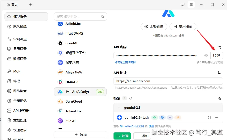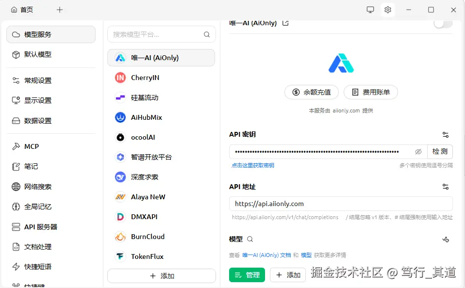 第二步:在模型服务中找到唯一AI(AiOnly),配置API密钥和API地址,在Cherry Stidio中API地址只需要配置域名即可:api.alionly.com