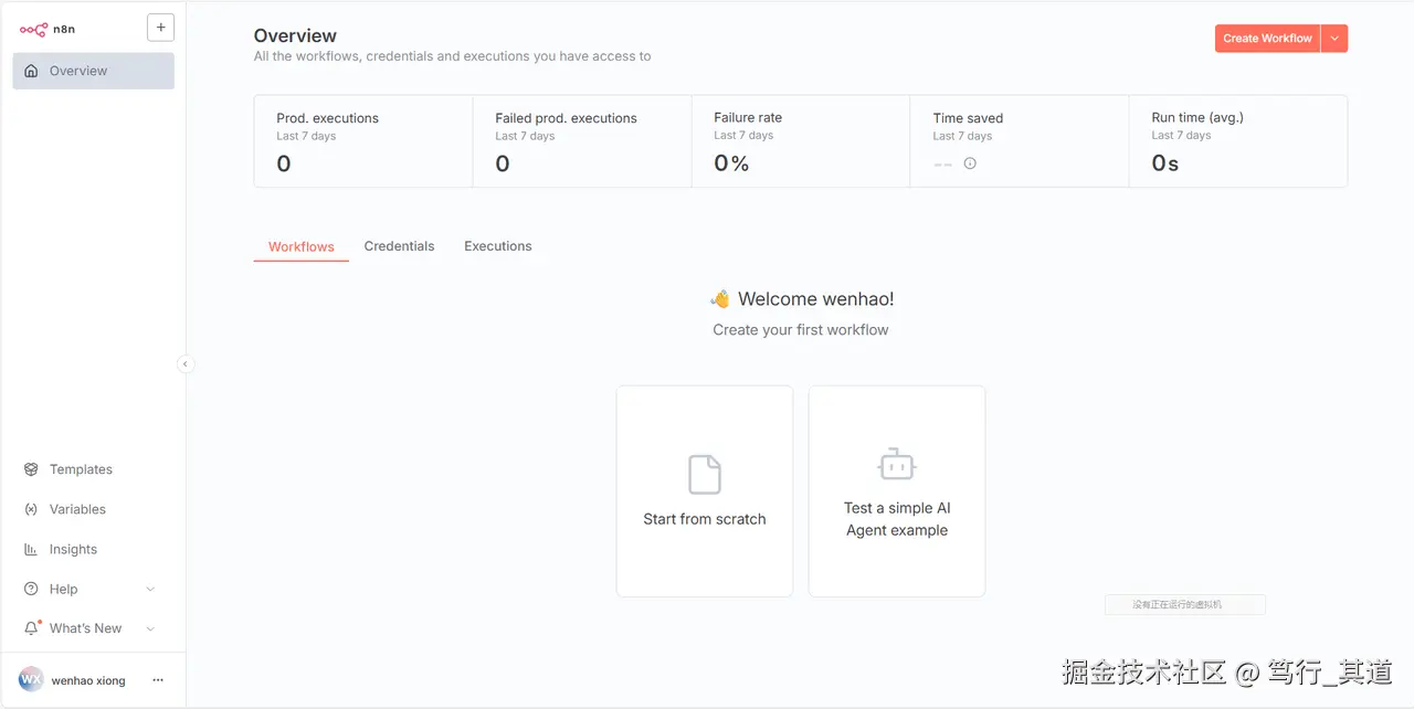 登录后进入到n8n的主页面。至此,我们已经成功部署n8n了。