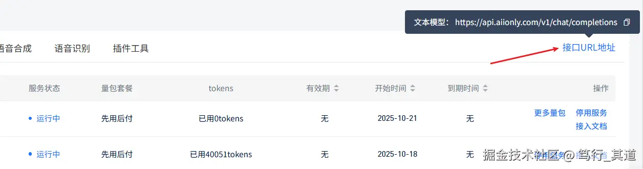 点击右侧的接口URL地址,可以看到兼容OpenAI的路径:api.aiionly.com/v1/chat/com…