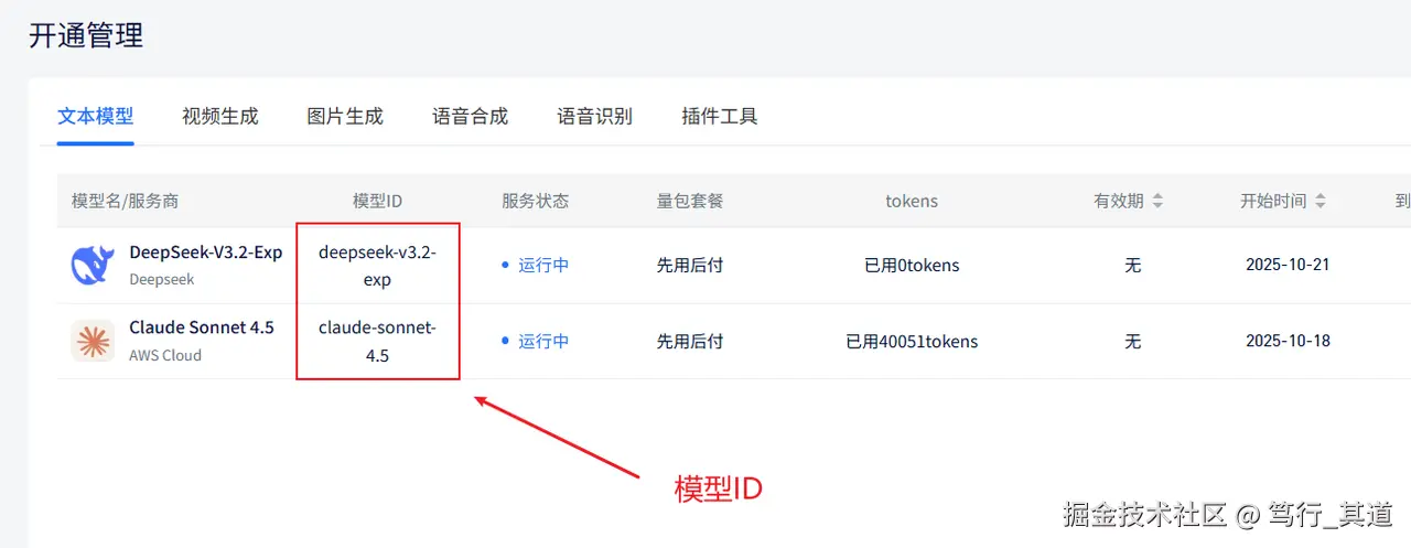 在开通管理中也能找到模型ID,后续我们要使用哪个模型就需要指定哪个模型的ID,也是相当重要的