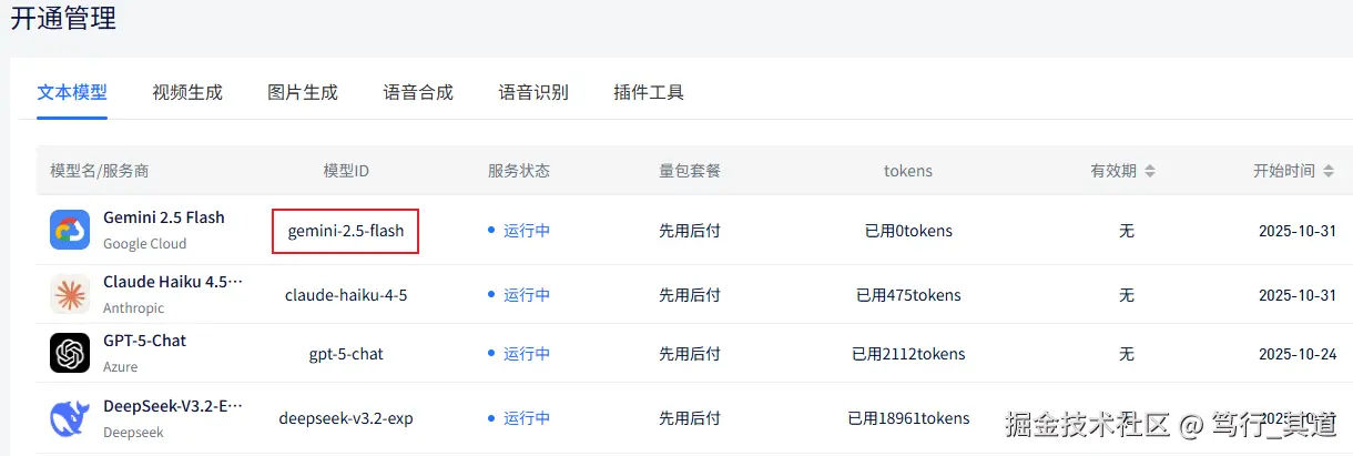开通完成后,可以到开通管理中找到模型ID:gemini-2.5-flash