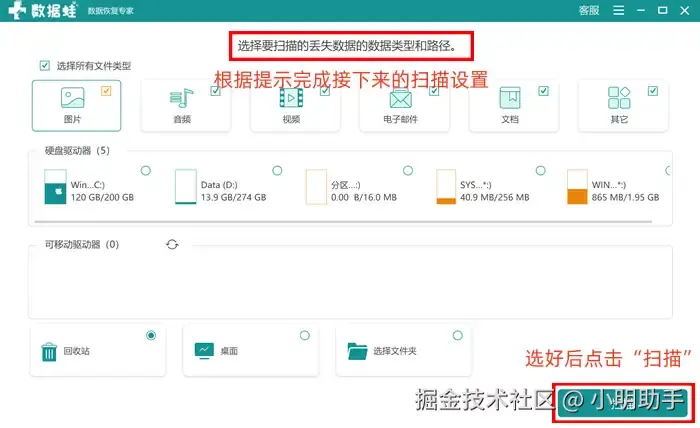 步骤1: 打开软件的首页,进行文件扫描的设置,根据提示完成设置后,点击“扫描”按钮;