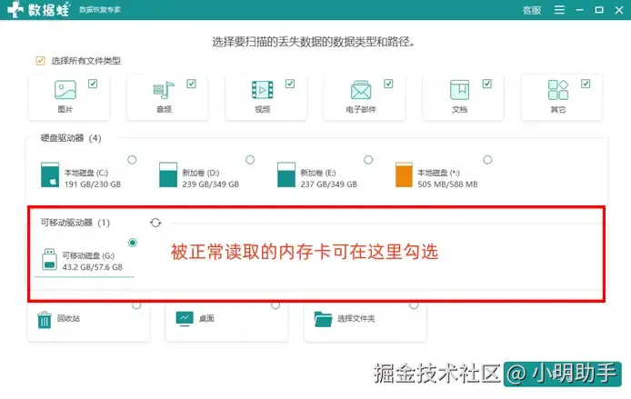 步骤1: 确保内存卡的读卡器可以被电脑识别后,打开软件;进入首页后可以在“可移动驱动器”中选择目标内存卡进行扫描;在上方可以选择单选或全选需要扫描的数据,完成选择后点击“扫描”按钮;