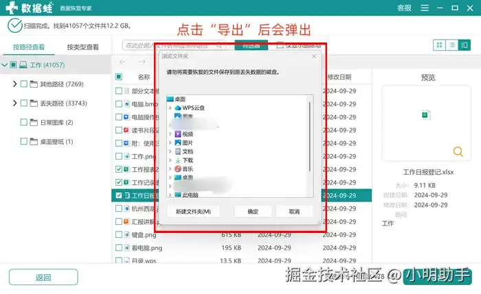 步骤2: 等待软件在左上角显示“扫描完成”后,我们就可以开启目标文件搜索模式,可借助软件的辅助工具(如“目录““搜索框”“筛选器”等)更快选中目标文件;选好后点击“导出”;