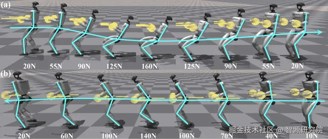 如下图所示,当机器人被建模为刚体并承受拉力时,它必须通过自适应地倾斜身体来调整质心位置,以满足上述平衡条件。这一原理正是我们奖励函数设计的核心,旨在引导机器人学习类人的姿态适应策略,以增强末端执行器的有效作用力,从而胜任高强度的力交互任务。