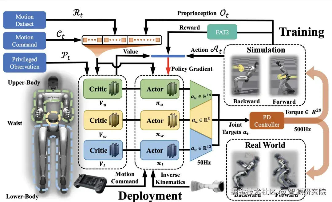 所有模块共享统一的全身观测信息作为输入,确保各项决策均基于对整体状态的全面感知。每个模块独立输出其对应身体部位的关节控制指令(期望角度),这些指令最终被拼接成完整的全身动作。在训练中,三个模块同步更新,但各自采用独立的奖励函数计算广义优势估计(GAE),从而实现针对性的策略优化。