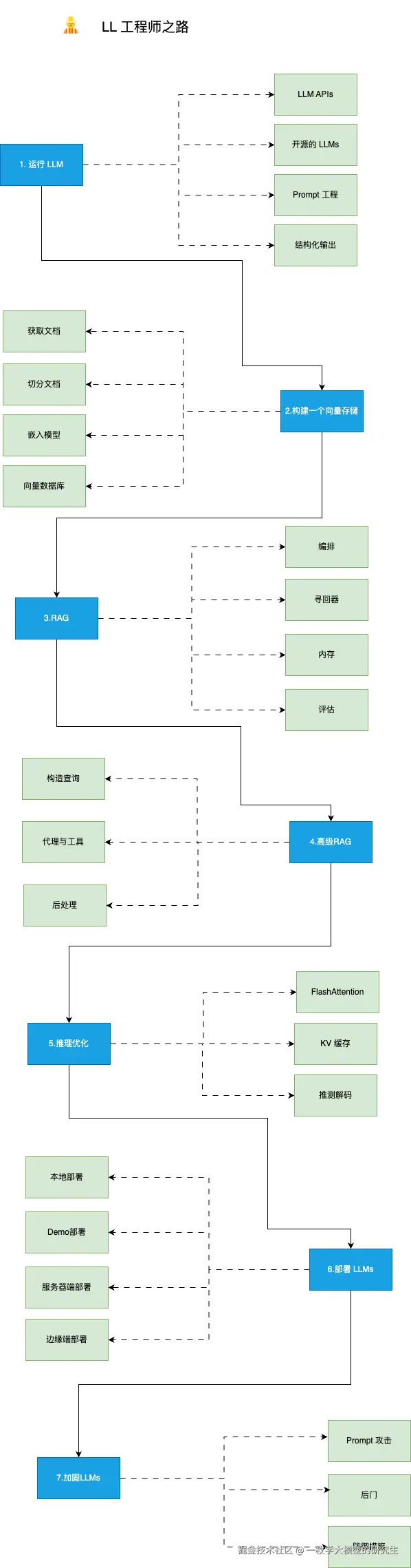 专注应用开发与部署,从基础模型调用开始,逐步深入向量存储构建、RAG增强、智能体开发、推理优化、部署落地,最终聚焦安全性,覆盖全生命周期。