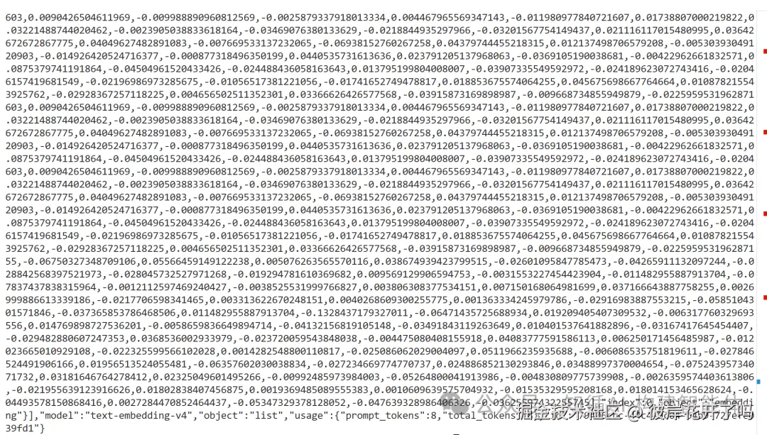 这里我们使用 embeddings 模型 "text-embedding-v4",并指定维度为1024。 同时,我们打印出返回的JSON字符串。
