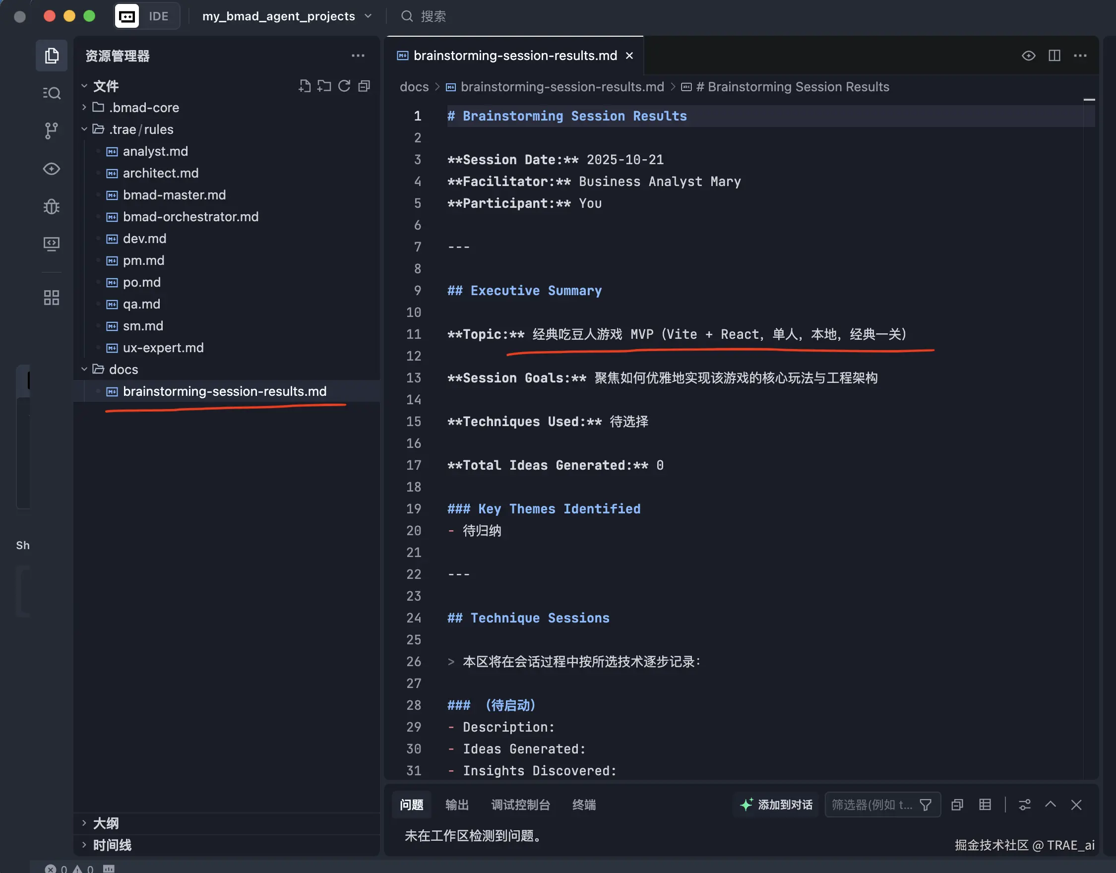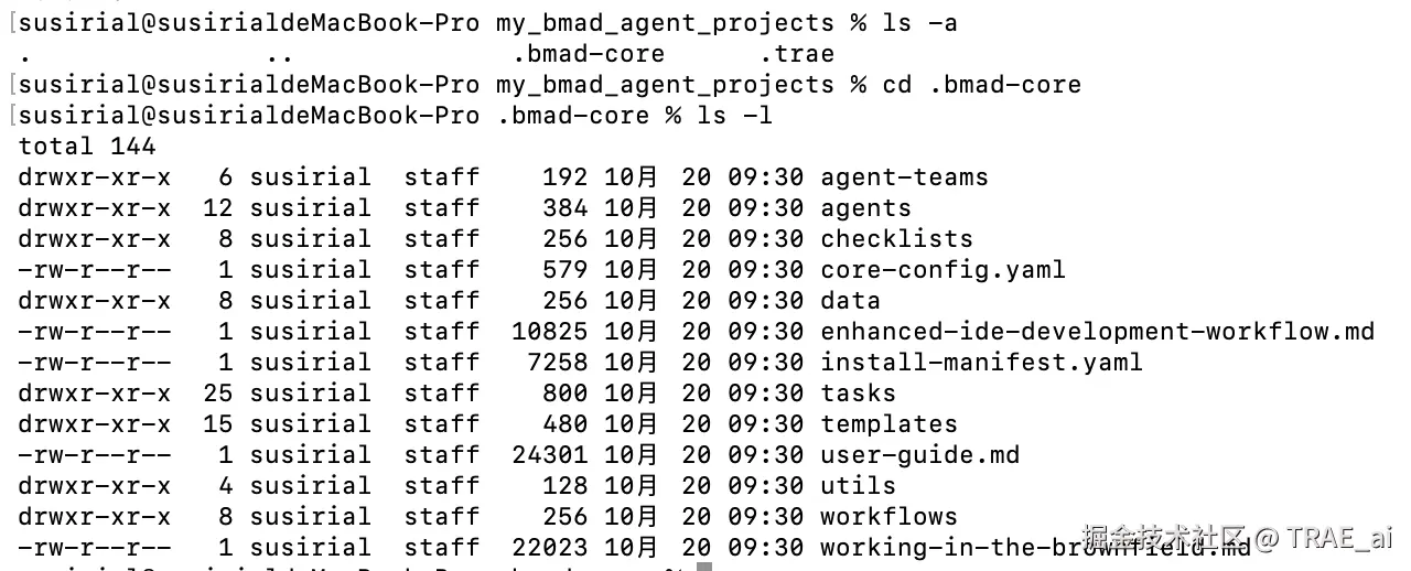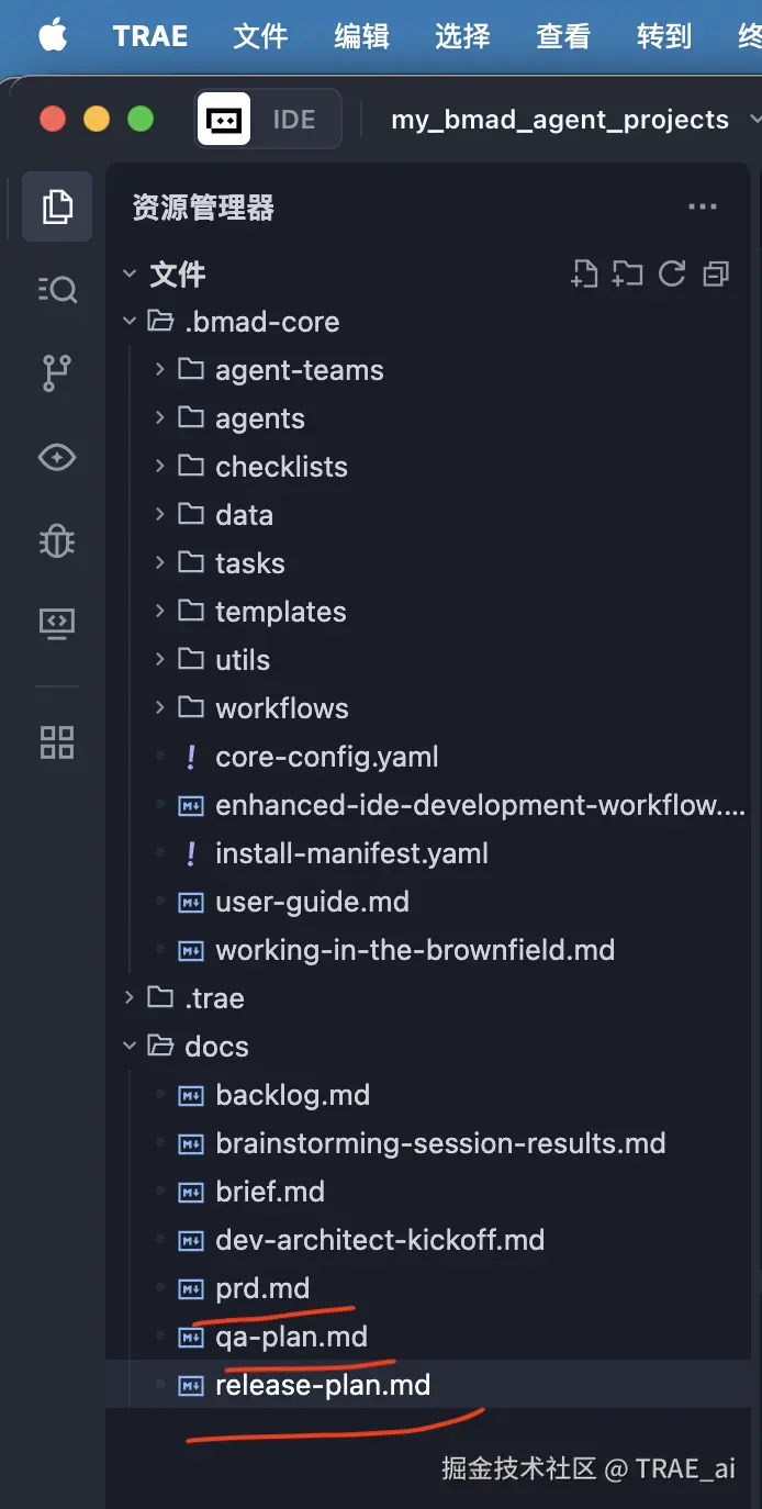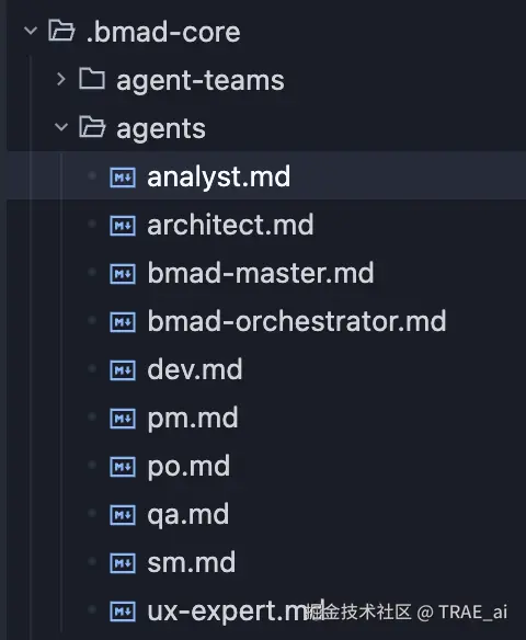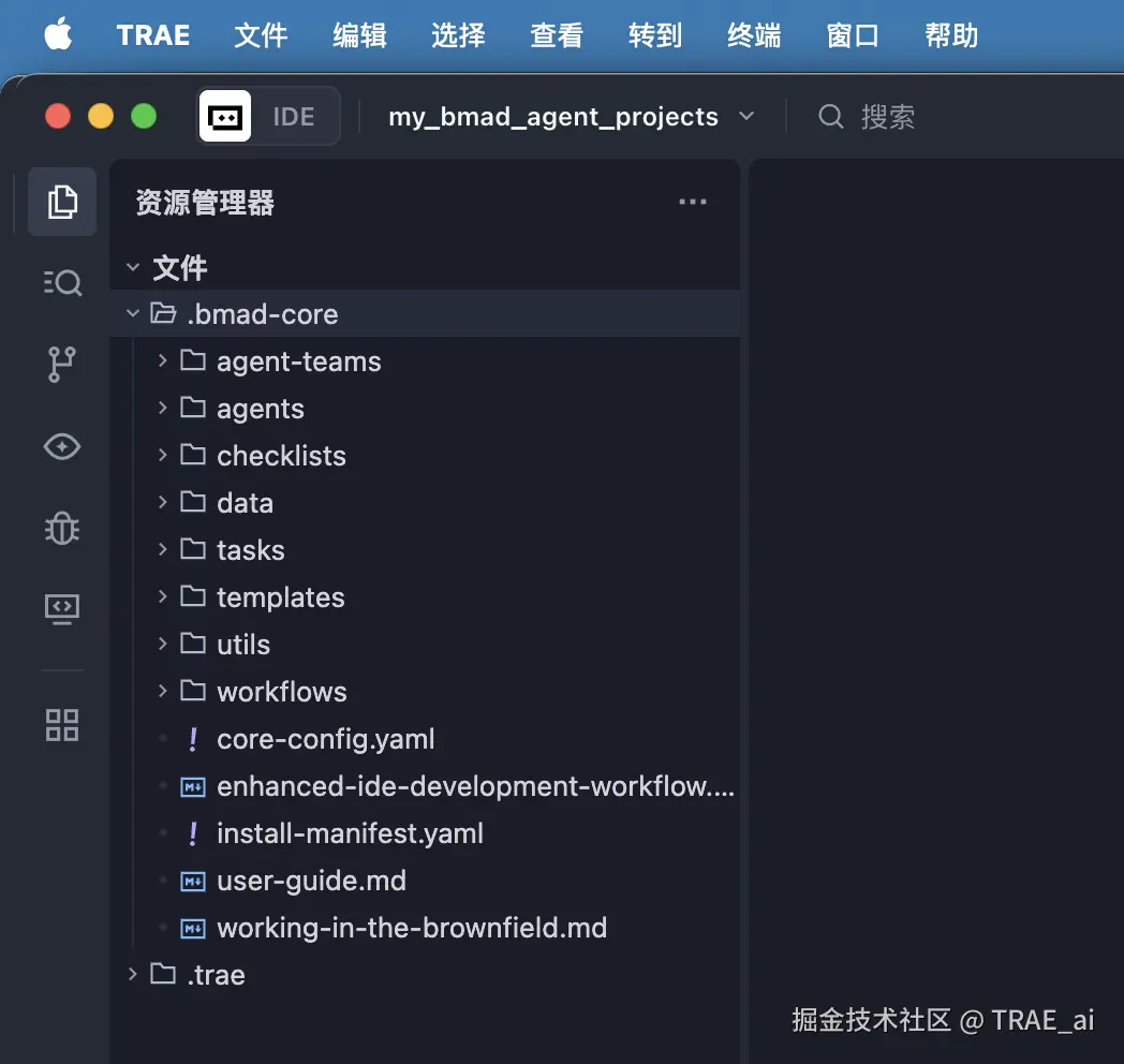 用 TRAE 打开刚才创建的项目目录,可以看到 .bmad-core 文件夹。