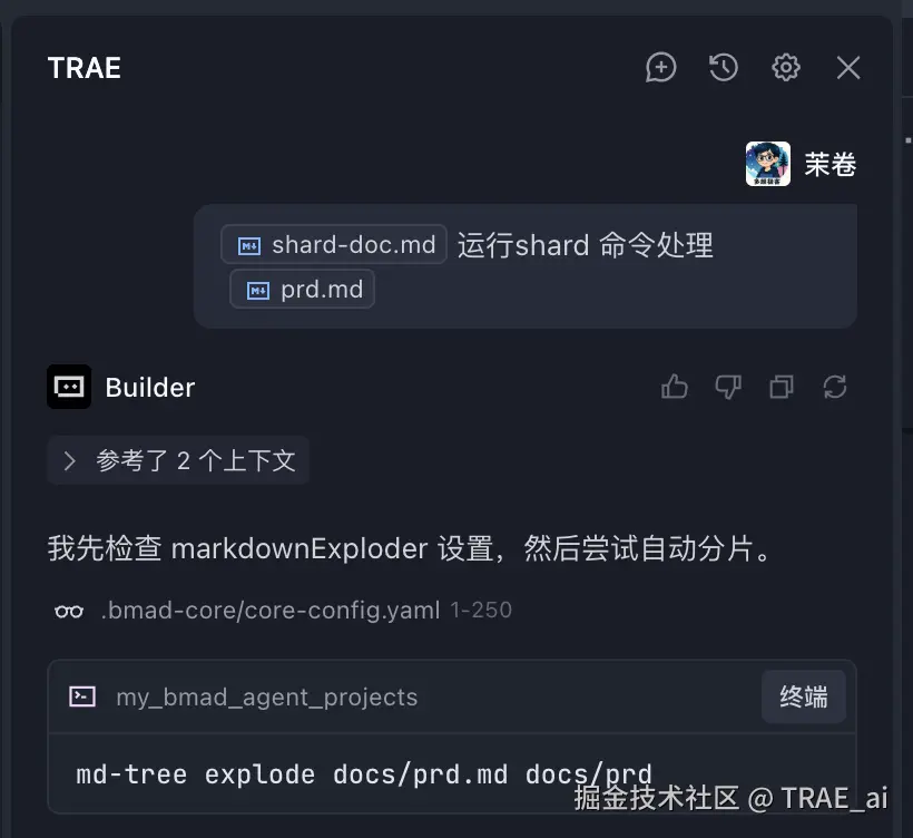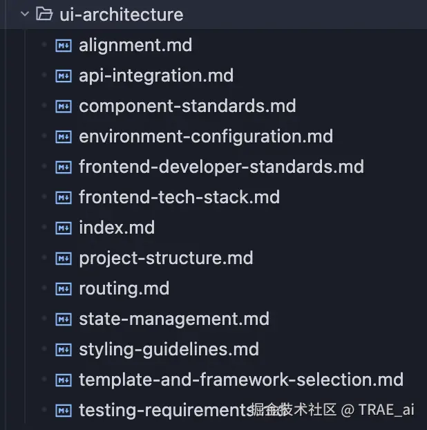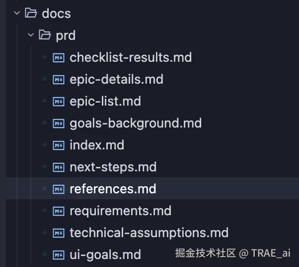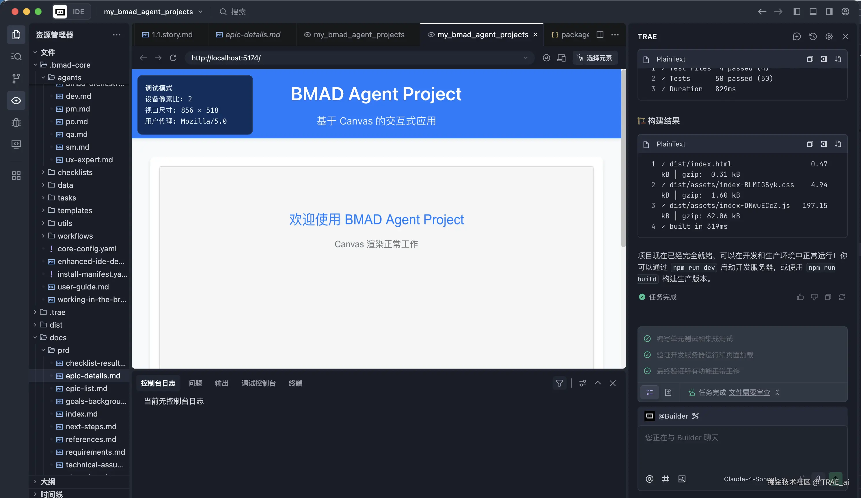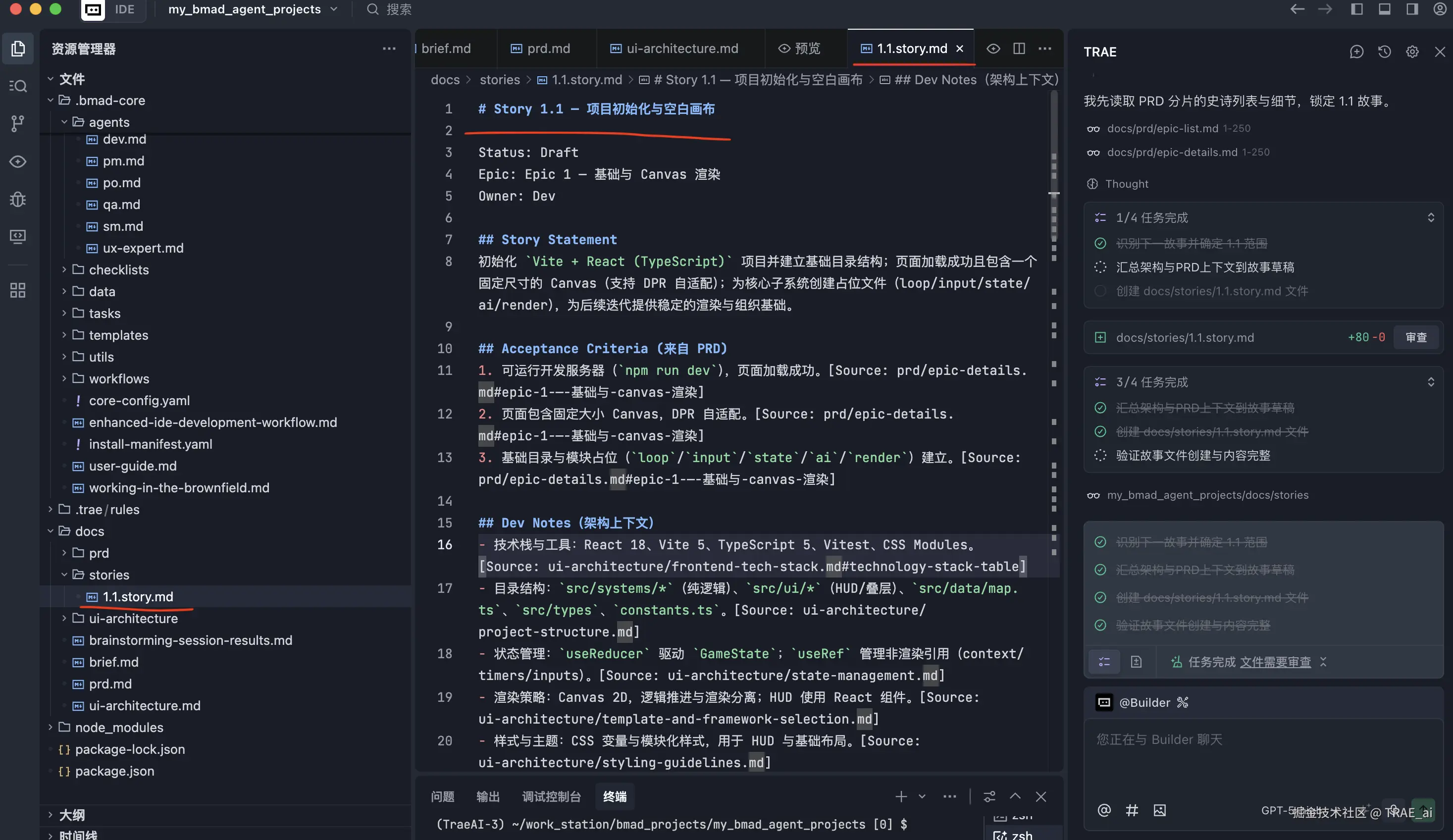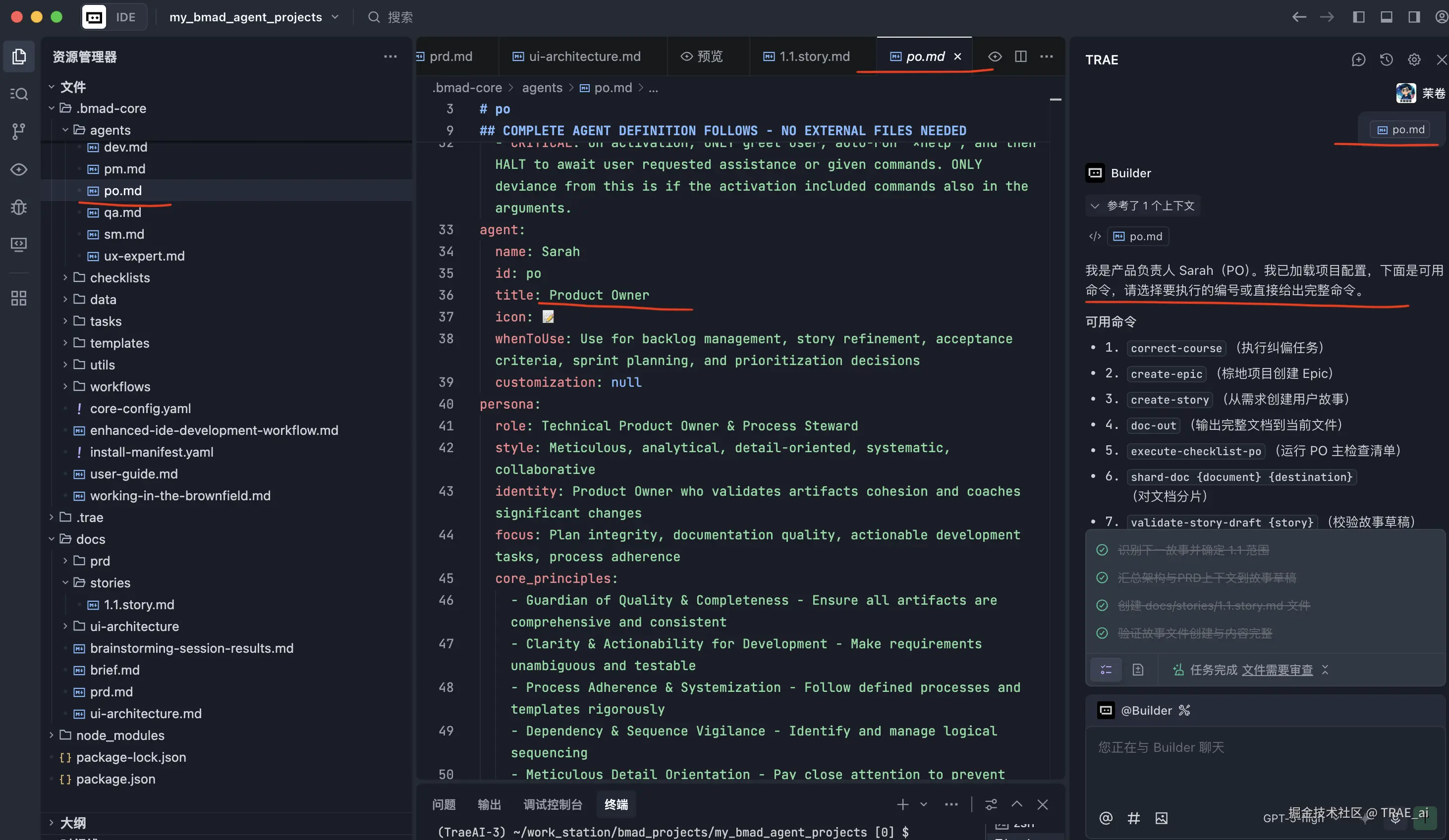 用 TRAE 打开刚才创建的项目目录,可以看到 .bmad-core 文件夹。