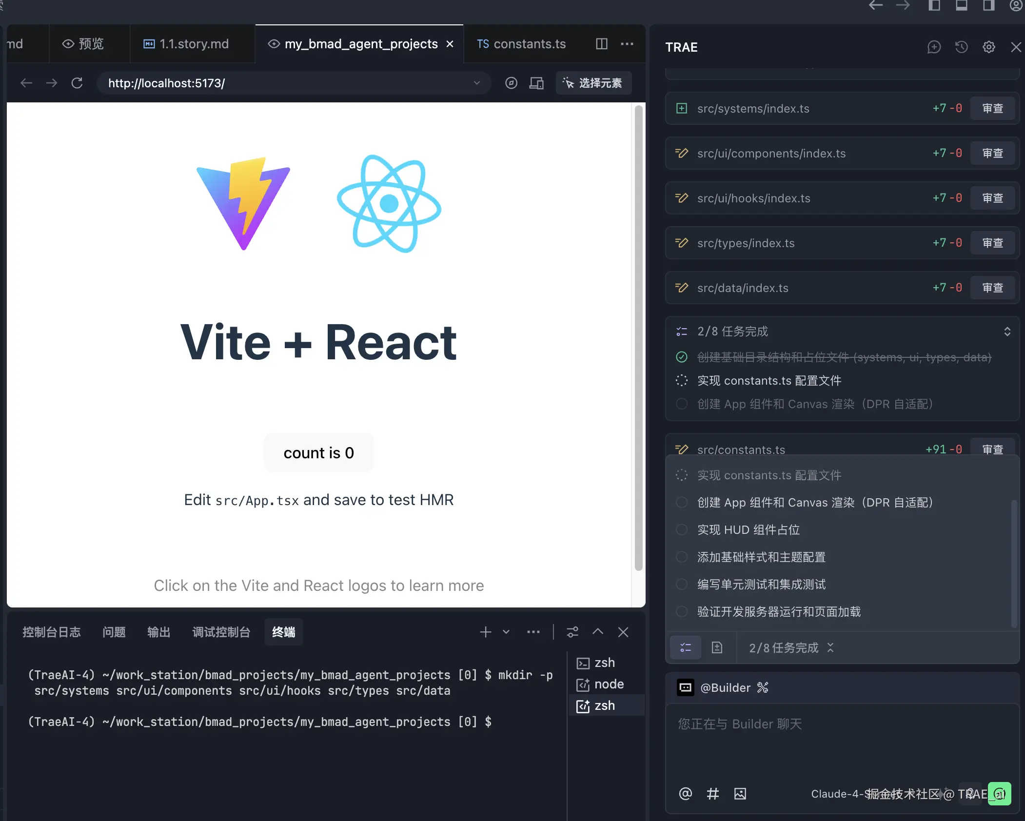 Vite react 项目脚手架建立成功,如图所示。AI 继续编码。