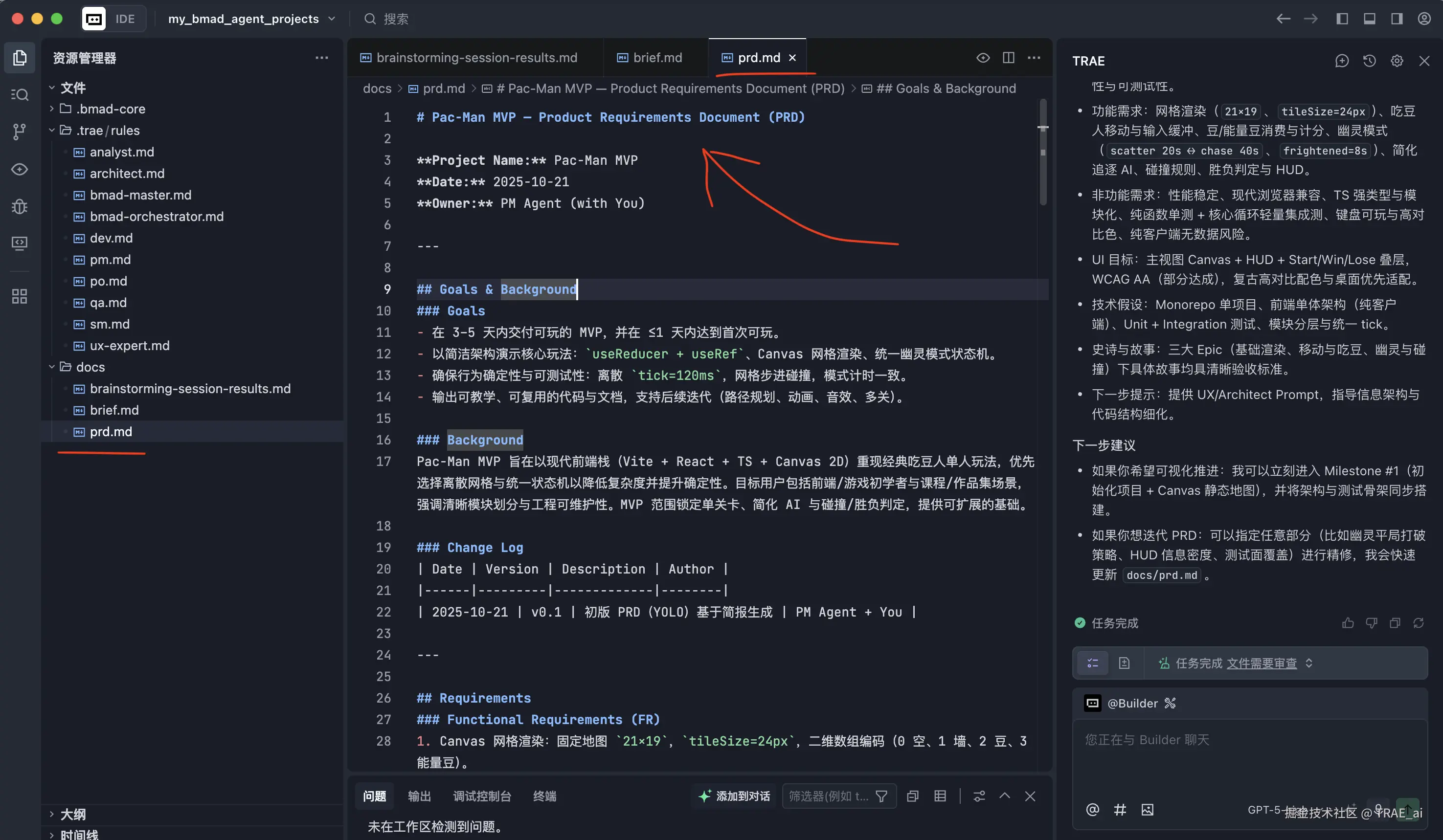 BMAD-METHOD(Breakthrough Method for Agile AI-Driven Development)是一个通用 AI 代理框架,专注于代理式敏捷驱动开发(Agentic Agile Driven Development)。它通过 AI 代理协作,帮助用户在软件开发、娱乐、创意写作、商业策略、个人健康等领域实现高效转型,解决传统 AI 辅助工作流中规划不一致和上下文丢失的问题。本文展示了用 BMAD-METHOD™框架构建经典吃豆人游戏的过程。