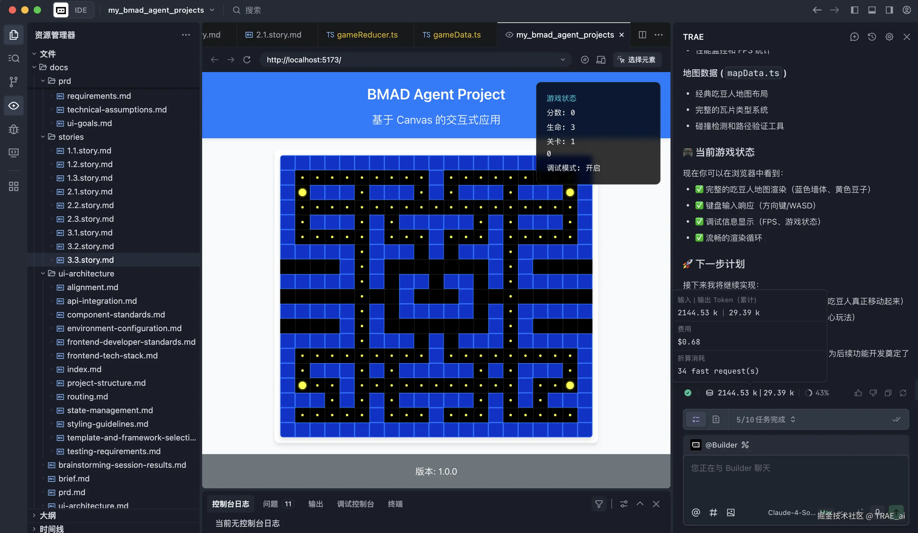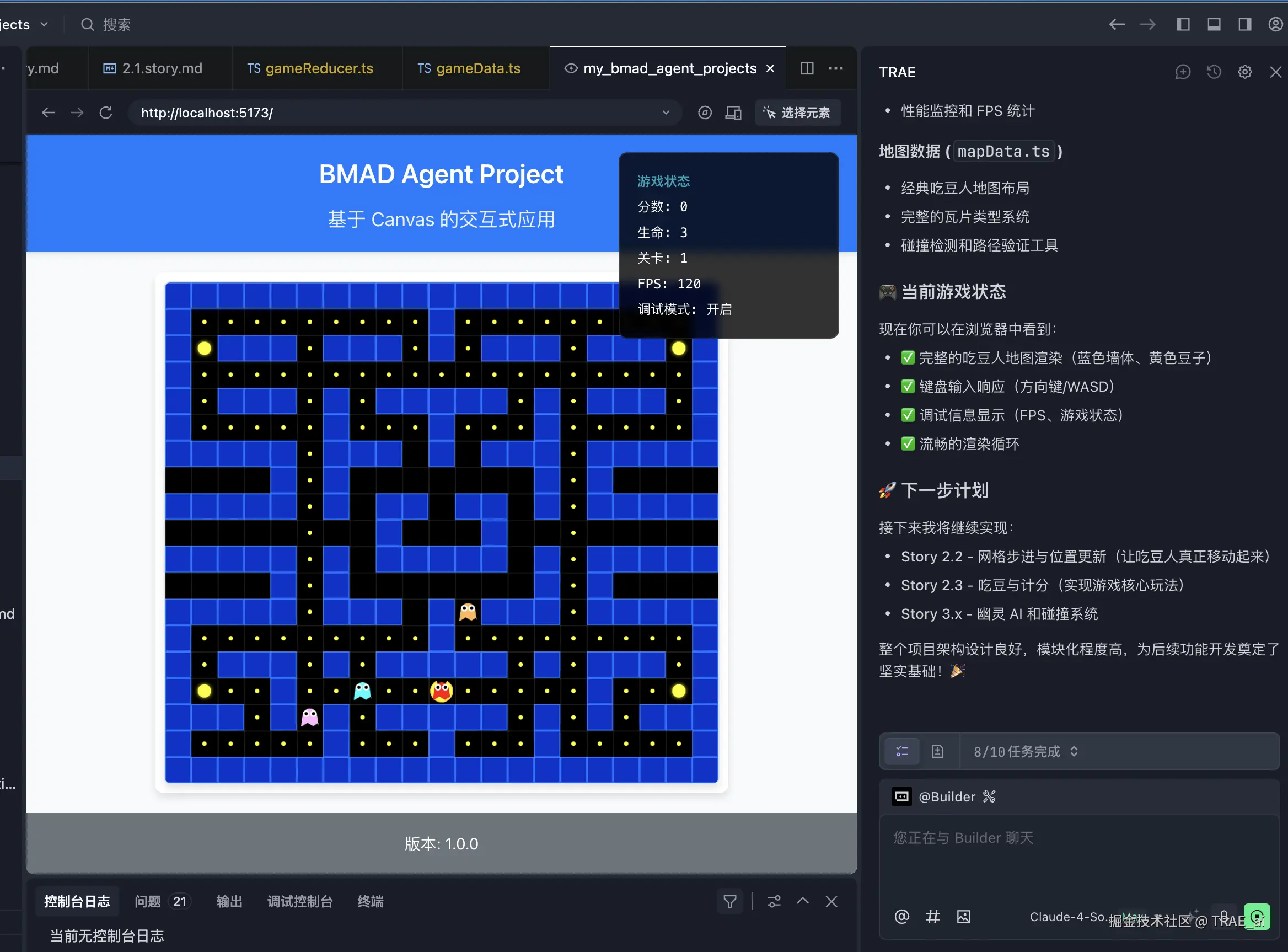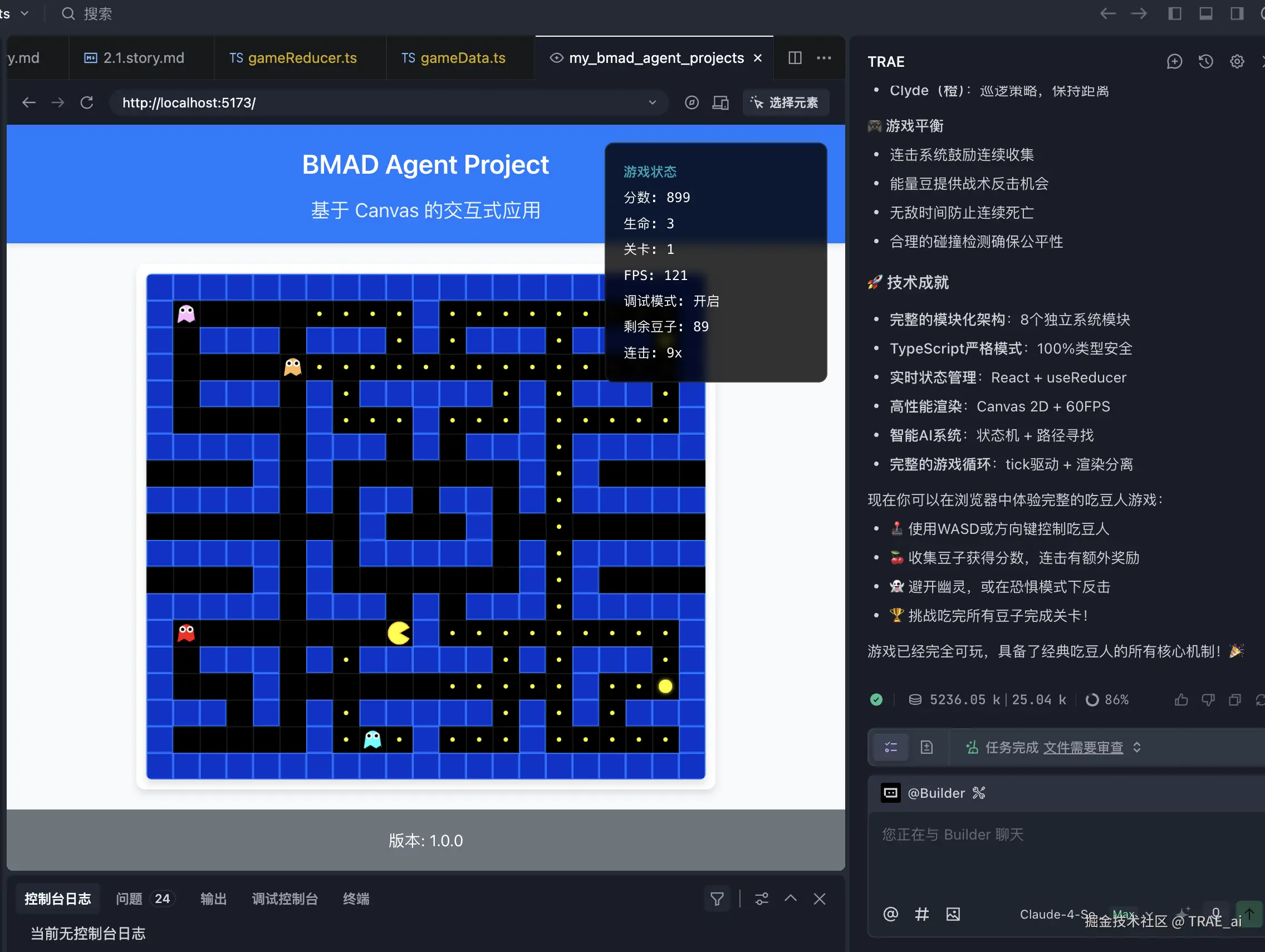 通过这个 BMAD-METHOD 的实战之旅,我们从一个简单的“经典吃豆人”idea 出发,历经头脑风暴、文档生成、用户故事拆解,到最终的代码迭代与优化,短短几步就构建出一个可玩的 MVP。