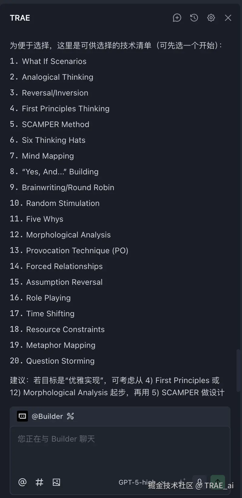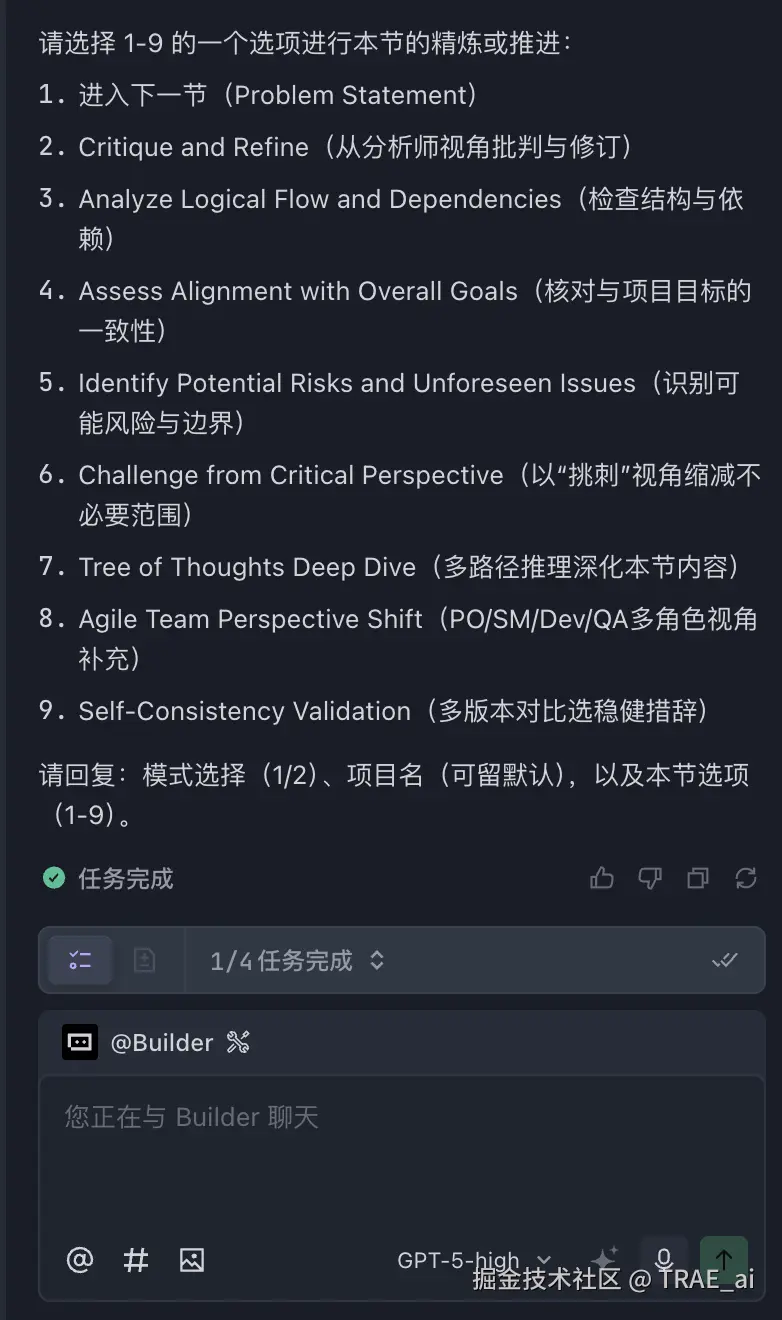 Bmad 给出了 20 种对话方式,根据我们的问题,她也给出了推荐。我们使用 AI 推荐的 “4 第一性原理”开始与 AI 进行头脑风暴。