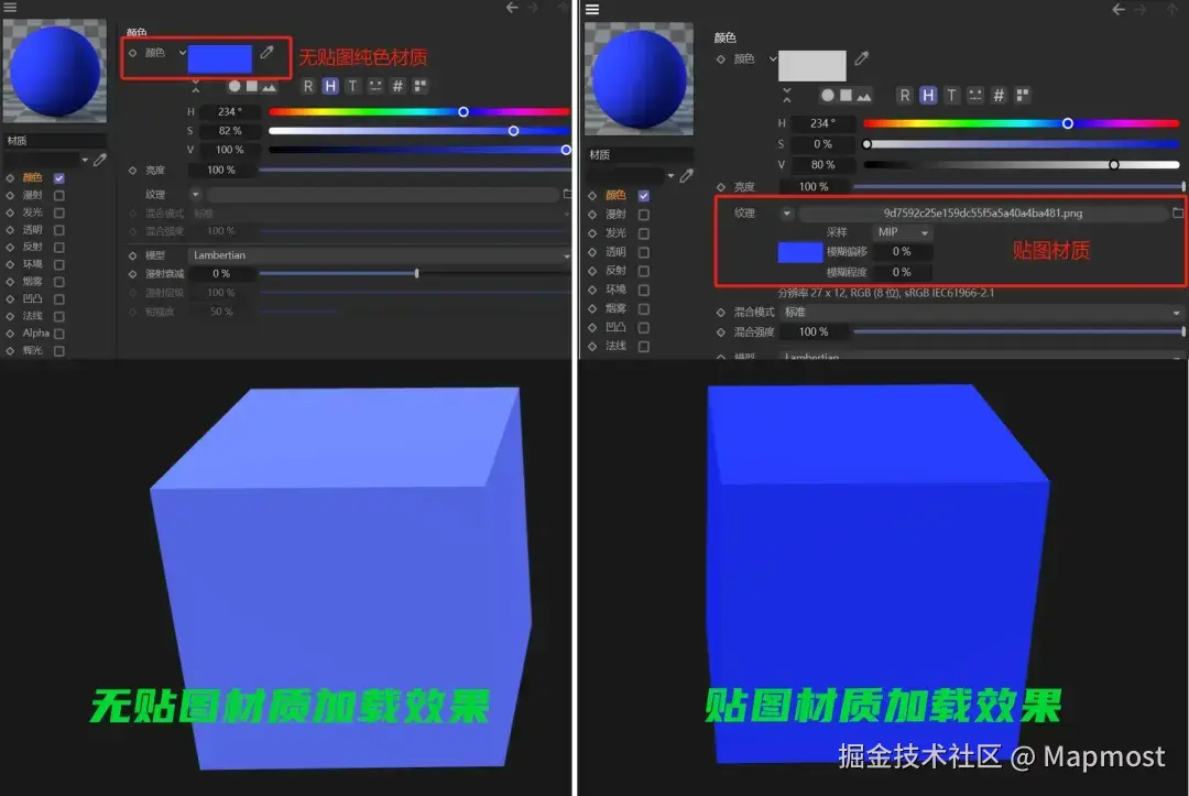 当模型在 WebGL 中出现“褪色”或颜色异常时,需检查纯色材质的实现方式。WebGL 不推荐直接使用材质通道中的 RGB 数值定义纯色,而应使用纯色纹理贴图(如 1×1 的 PNG 或 JPG)替代。这样可避免因不同平台或引擎对 RGB 值解析差异导致的颜色偏差。