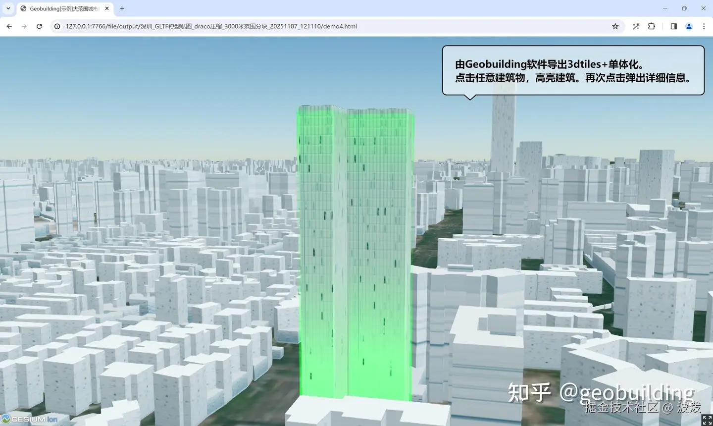 Geobuilding模型处理,深圳市科技风贴图建筑物3dtiles倾斜摄影数据 波泼 2025-11-07 32 阅读1分钟 包含建筑点击单体化代码,近60万数据流畅加载 使用科技风贴图,批量贴图 使用Geobuilding软件导出3dtiles格式,包含cesium demo