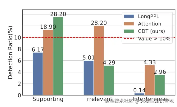 我们在合成任务上对比了三种检测方法:LongPPL、基于注意力的检测和 CDT。如图 9 所示,基于注意力的方法虽然能检测到大量关键 token,但同时也误检了许多不相关 token;LongPPL 虽能抑制噪声检测,但难以准确定位支持 token;而 CDT 不仅在关键 token 检测上表现最佳,还能有效抑制噪声 token。