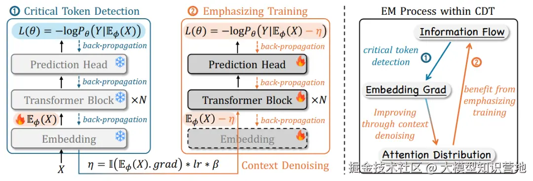 图 7:我们提出的 CDT(上下文去噪训练)方法。它包括两个步骤:(1)检测长上下文中的关键标记,(2)利用去噪上下文进一步强调训练。值得注意的是,CDT可以理解为期望最大化(EM)过程,其中模型基于信息流检测噪声,并通过消除噪声来改进训练,从而增强信息流。
