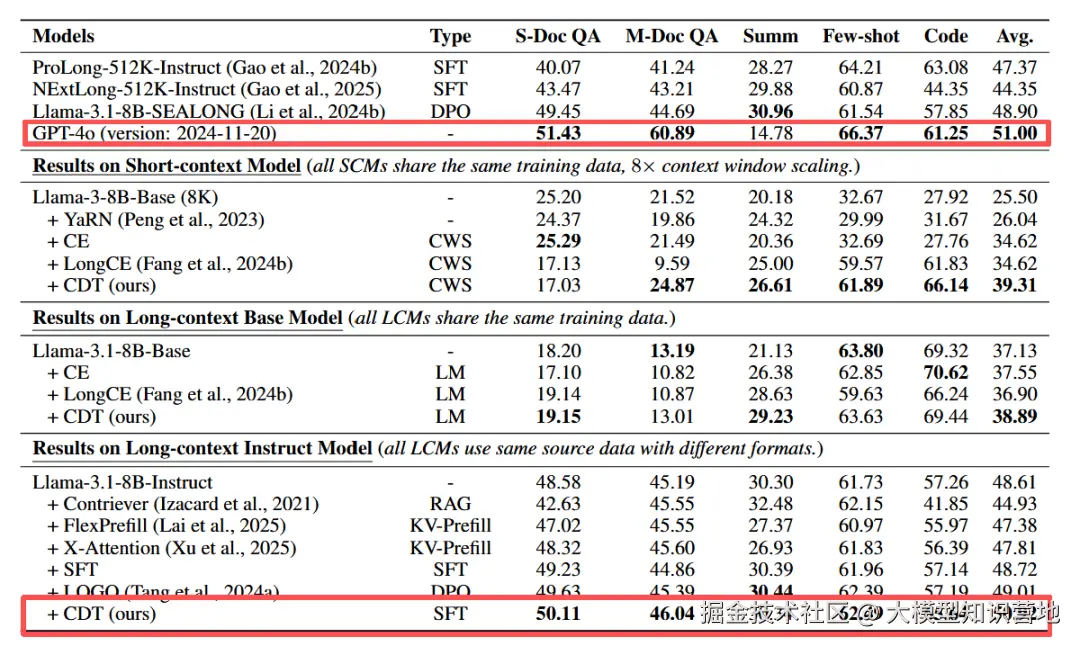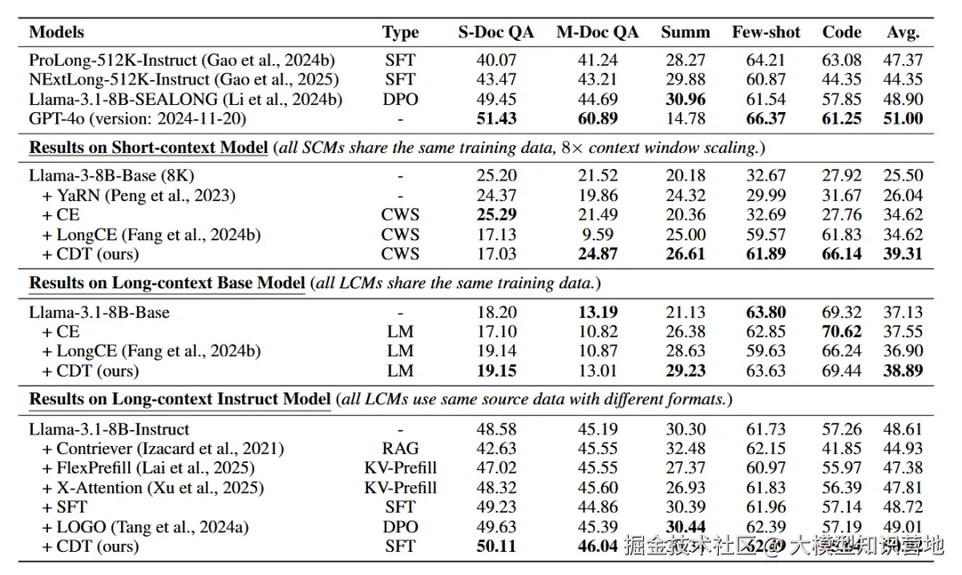我们在多种任务类型(包括短上下文与长上下文场景)以及不同模型上的实验结果(图1)表明,CDT 方法显著优于现有训练策略。更令人振奋的是,经过 CDT 训练后,一个开源的 80 亿参数模型在真实世界长上下文任务中达到了与 GPT-4o 相媲美的性能(50.92 分 vs. 51.00 分)。