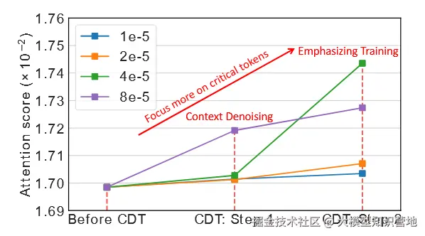 我们可视化了不同学习率下 CDT 训练过程中关键 token 注意力分数的变化(图 10)。结果显示,在去噪步骤后,关键 token 的注意力分数显著提升,且在强调训练阶段后进一步增加。学习率越大,改进越明显,但在 8e-5 附近达到饱和。