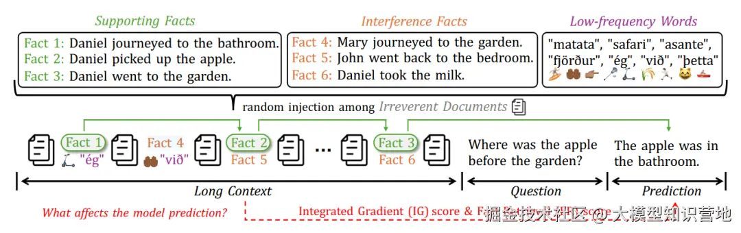 图 3:合成任务的格式示例,要求模型在多跳支持事实中推理并预测答案,同时需区分干扰事实,并抵御无关文档和低频词的干扰。