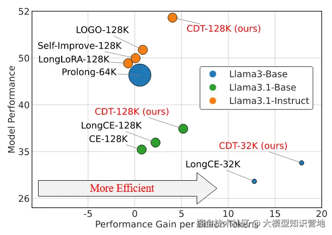 图2:不同训练方法在现实世界长上下文任务上的模型性能以及每十亿个token的性能增益的比较概述。气泡大小表示相对训练数据量。