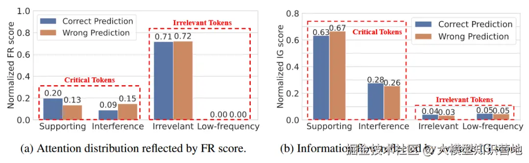 如图4所示,可以发现,基于注意力分布的 FR 分数(图4a)存在明显局限:无论模型回答正确与否,其注意力都会显著分散到无关 token 上。相比之下,我们提出的 IG 分数(图4b)表现出更好的判别能力:无论模型响应正确与否,关键令牌的 IG 分数始终显著高于不相关令牌,显示出对关键信息更强的敏感性。