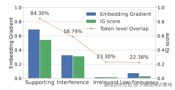 图 4:FR分数和IG分数在定位关键token任务上的表现比较。结果显示,在关键令牌检测任务中,IG 分数相比 FR 分数能够更有效地过滤噪声令牌(不相关文档和低频词)。