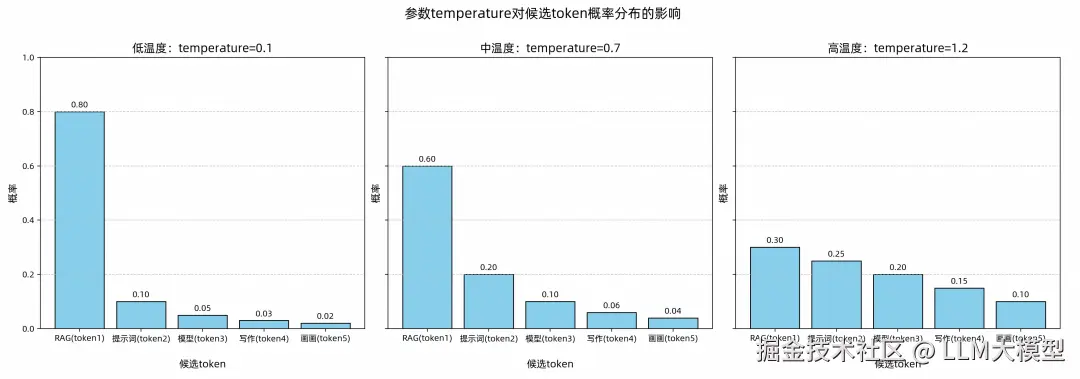 由上图可知,温度从低到高(0.1 -> 0.7 -> 1.2),概率分布从陡峭趋于平滑,候选Token“RAG”从出现的概率从0.8 -> 0.6 -> 0.3,虽然依然是出现概率最高的,但是已经和其它的候选Token概率接近了,最终输出也会从相对固定到逐渐多样化。