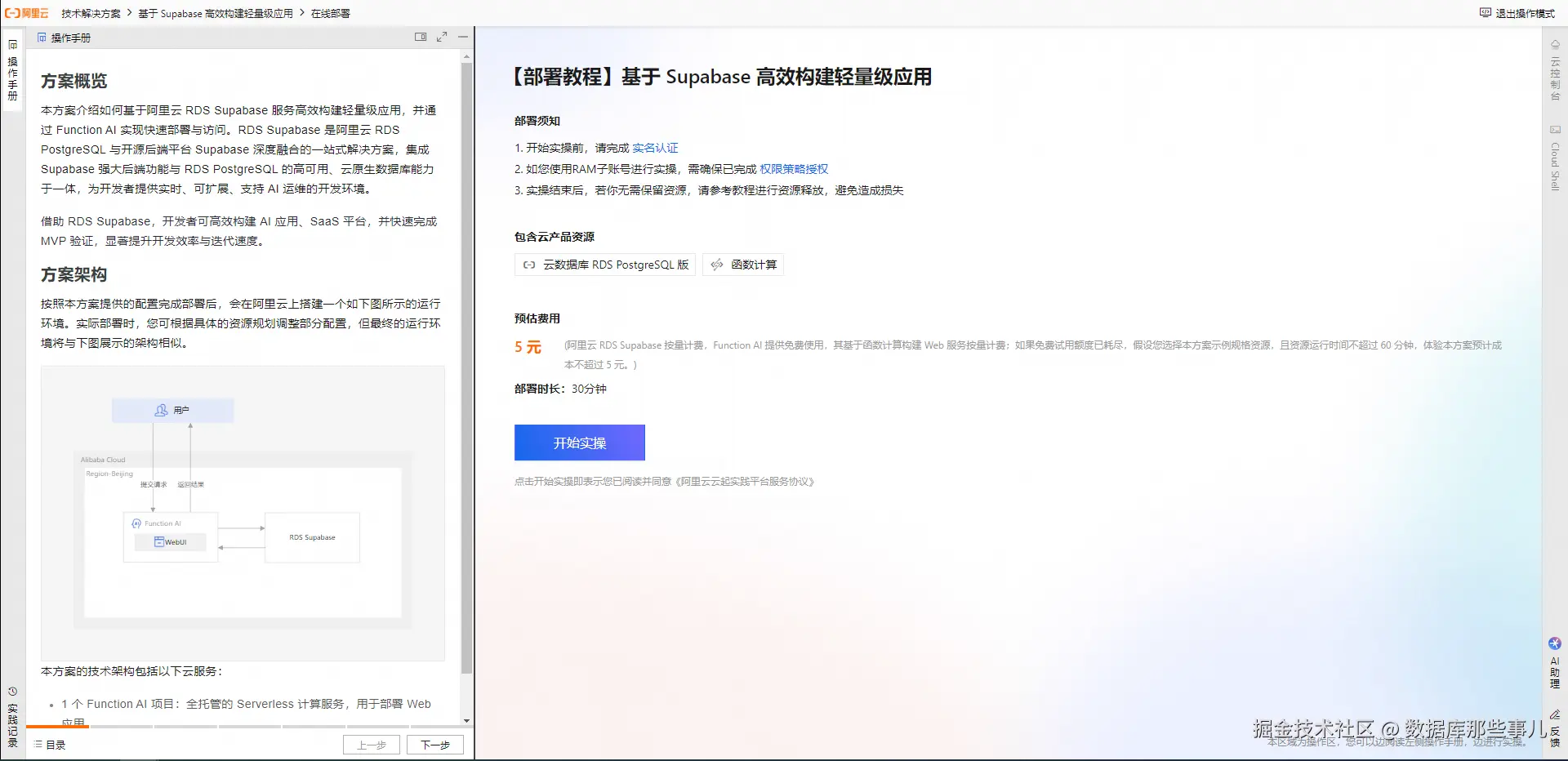 本方案将介绍如何基于阿里云 RDS Supabase 服务高效构建轻量级应用,深度融合了高可用的 RDS PostgreSQL 数据库能力与 Supabase 的强大后端功能,提供开箱即用的数据库管理、身份认证和实时 API 等服务,极大地简化了后端开发流程。并支持智能运维,显著降低技术门槛与资源消耗,助力中小团队高效交付高质量应用。