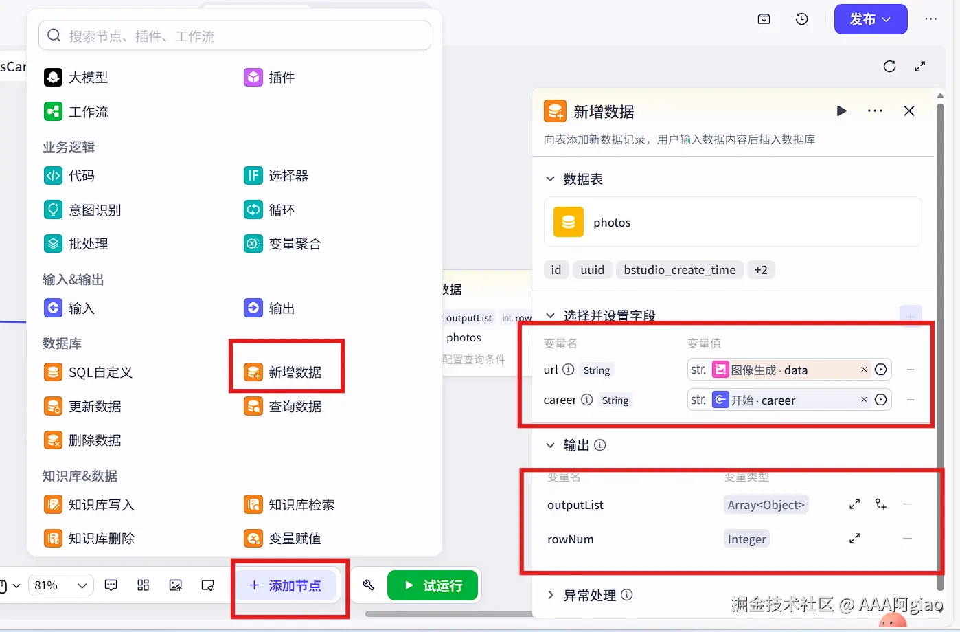 在 新增数据 节点后再添加一个 查询数据 节点,并进行图内配置