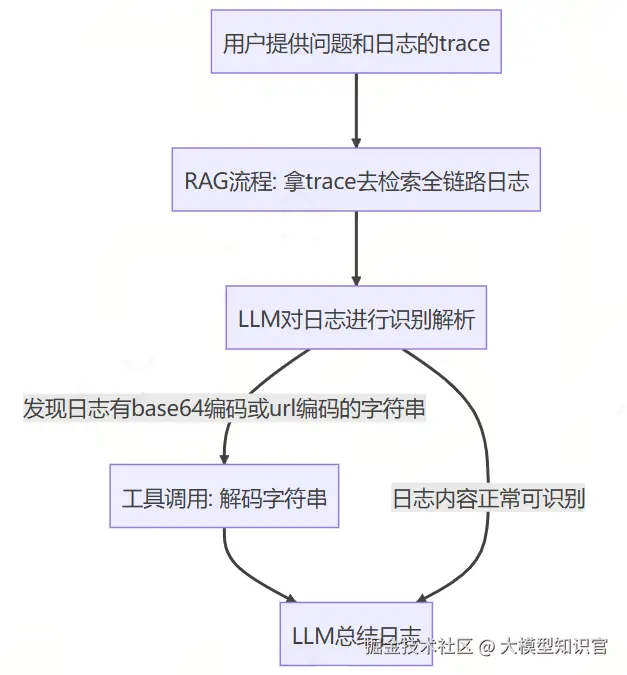 这样的流程看似解决了日志编码问题,可以让LLM对日志进行分析、定位错误。但是,实际线上日志存在字符串被编码过2次的情况,如:前端传入特定字符串的时候会先进行url编码,后台再进行base64编码,最后后台打印出日志。此时,按照上述的chain进行逻辑处理就会发现:只进行一次解码后的字符串并没有达到我们的目标——将需要解码的日志解码为正常的内容。所以,我们又得去修改chain的流程图,兼容这种情况。但是,其实LLM本身就可以调用两种类型的解码工具,理想的情况应该是它自己识别出字符串需要2次解码,然后自行组合工具去完成解码,而不是需要人类去调整流程图。