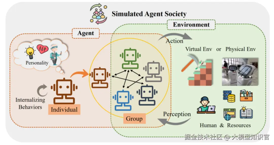 - 右侧部分:是外部环境交互,主要通过开发提供的工具,为agent提供路径,去感知外界反馈。环境的形式可以是虚拟的沙盒环境,也可以是真实的物理世界。环境中的要素包括了人类参与者和各类可用资源。对于单个代理而言,其他代理也属于环境的一部分。