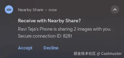 Nearby Share 是 Google 的无线共享功能,它使用蓝牙 + Wi-Fi Direct 在Android设备之间传输文件。与蓝牙相比,Nearby Share 速度更快、更易用,并且适合一次发送多首歌曲。