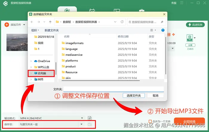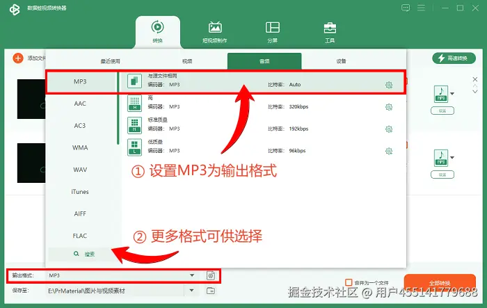 第二步: 想要批量更改音频格式?点击左下方的 【输出格式】 ,在音频栏目下选择 【MP3-与源文件相同】 选项。