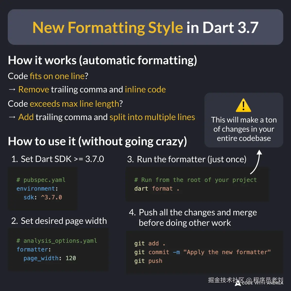 而Dart 3.7引入了新的格式化风格,会根据代码是否超出最大页面宽度自动决定是否添加尾随逗号。