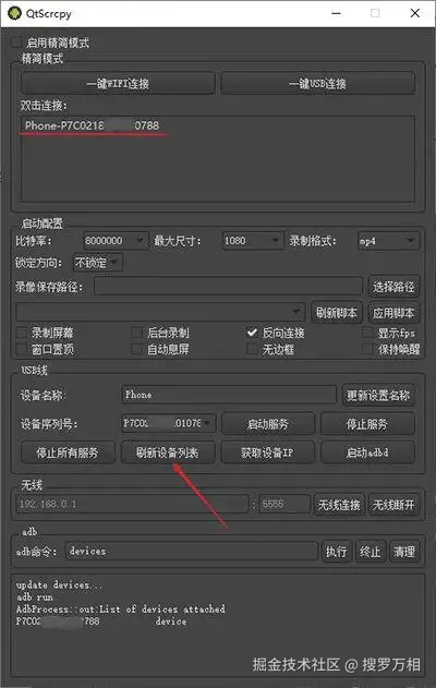 点击刷新设备,会看到有设备号更新出来,点击获取设备IP,点击启动adbd