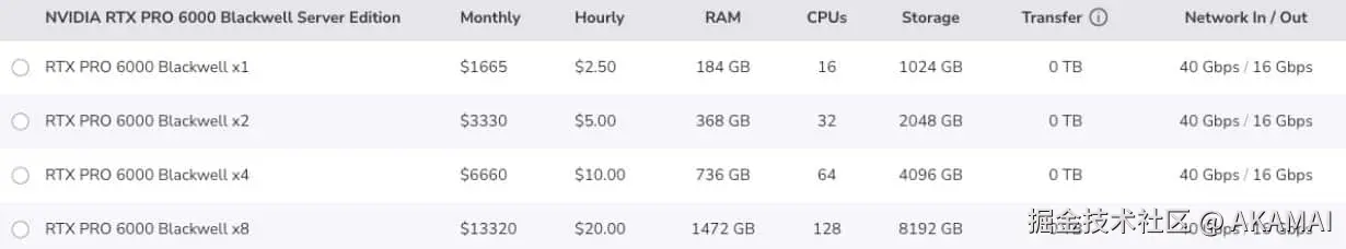 MLOps工程师可以按小时租用单个GPU,也可以构建包含多达8个NVIDIA RTX PRO™ 6000 Blackwell服务器版GPU、NVIDIA BlueField-3® DPU、128个vCPU、1,472 GB DRAM和8,192 GB NVMe的高性能推理集群。(图1)