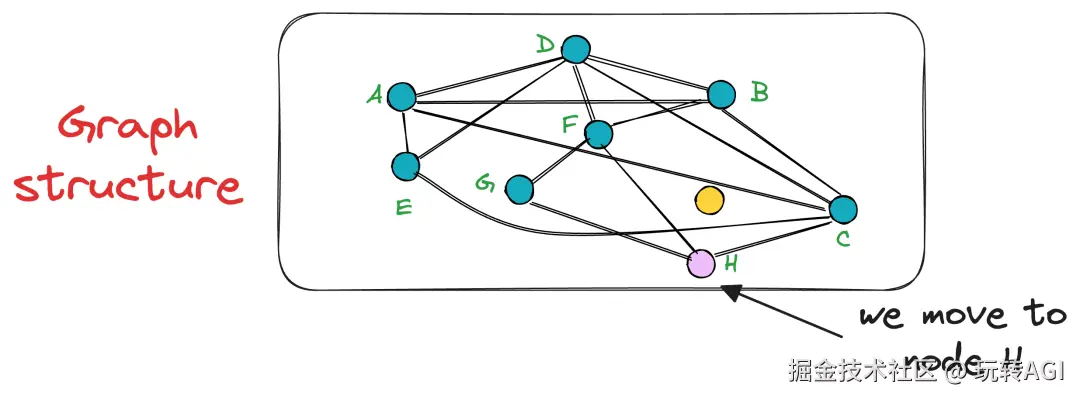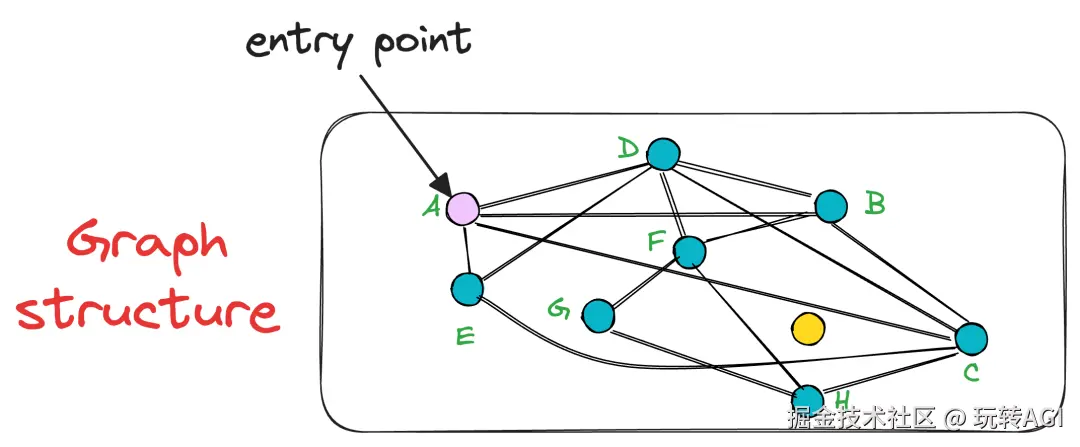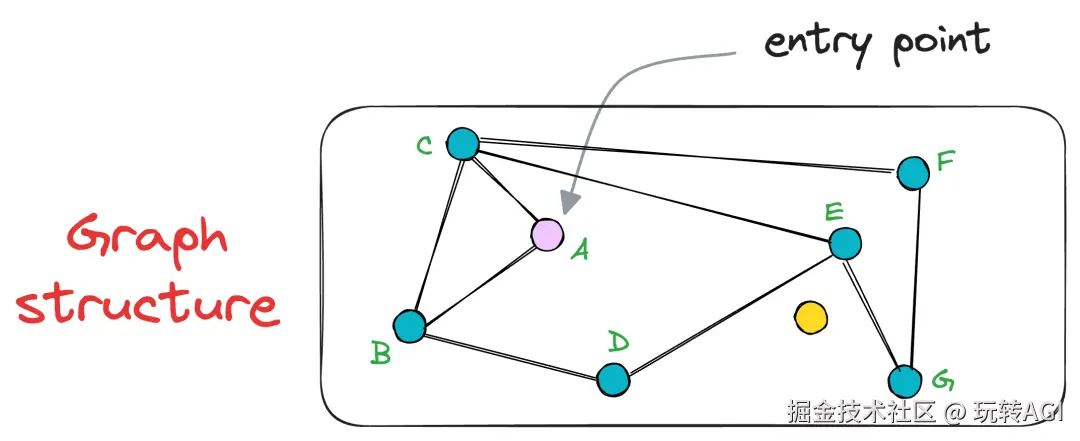 为了开始搜索,会随机选择一个入口点,这也是该算法的精妙之处。换句话说,NSW 的一个关键优势在于可以从图中的任何顶点发起搜索G。假设我们选择节点A作为入口点: