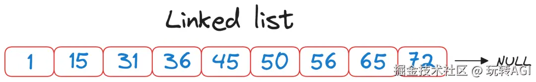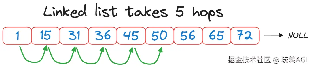 现在,让我解释一下跳过列表如何加速搜索过程。假设我们想在这个列表中找到元素50。