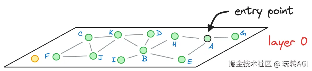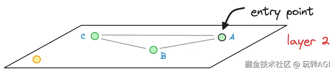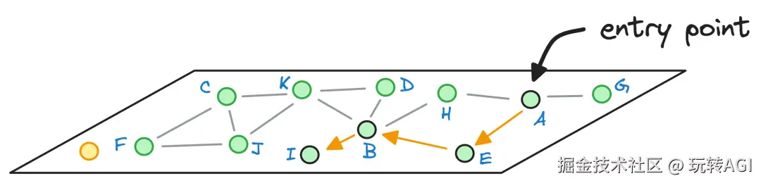 例如,考虑下面的图,其中节点A是入口点,黄色节点是我们需要最近邻的向量: