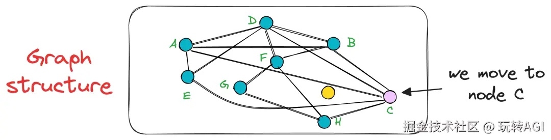 在选定初始点之后,算法会迭代地寻找距离查询向量Q最近的邻居(即连通的顶点)。例如,在本例中,顶点A有邻居B,C,D,E。因此,我们将计算这些邻居与查询向量Q的距离(或相似度,无论你选择什么作为度量标准)。在这种情况下,节点C最近,因此我们从节点A移动到节点C。