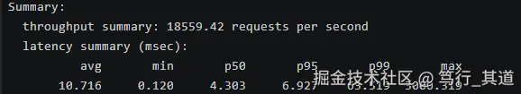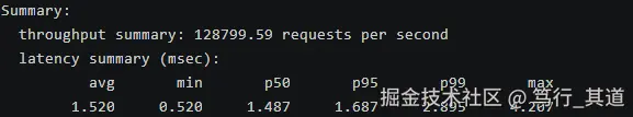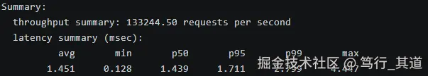 --clients=50:每个线程 50 个客户端连接--threads=8:8 个线程,总共 400 个并发连接--requests=10000:每个客户端 10000 个请求--ratio=1:10:读写比 1:10(10% 写,90% 读)--pipeline=10:使用 pipeline,每次发送 10 个命令