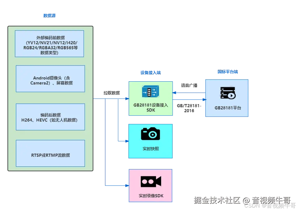 外部设备与数据源接入:SDK支持接入外部编码前视频数据(如YUV数据)、音频数据(如PCM数据),以及外部编码后的视频和音频数据(如H.264和AAC)。这使得SmartGBD能够与多种设备和系统进行集成,增强了平台的兼容性和扩展性。
