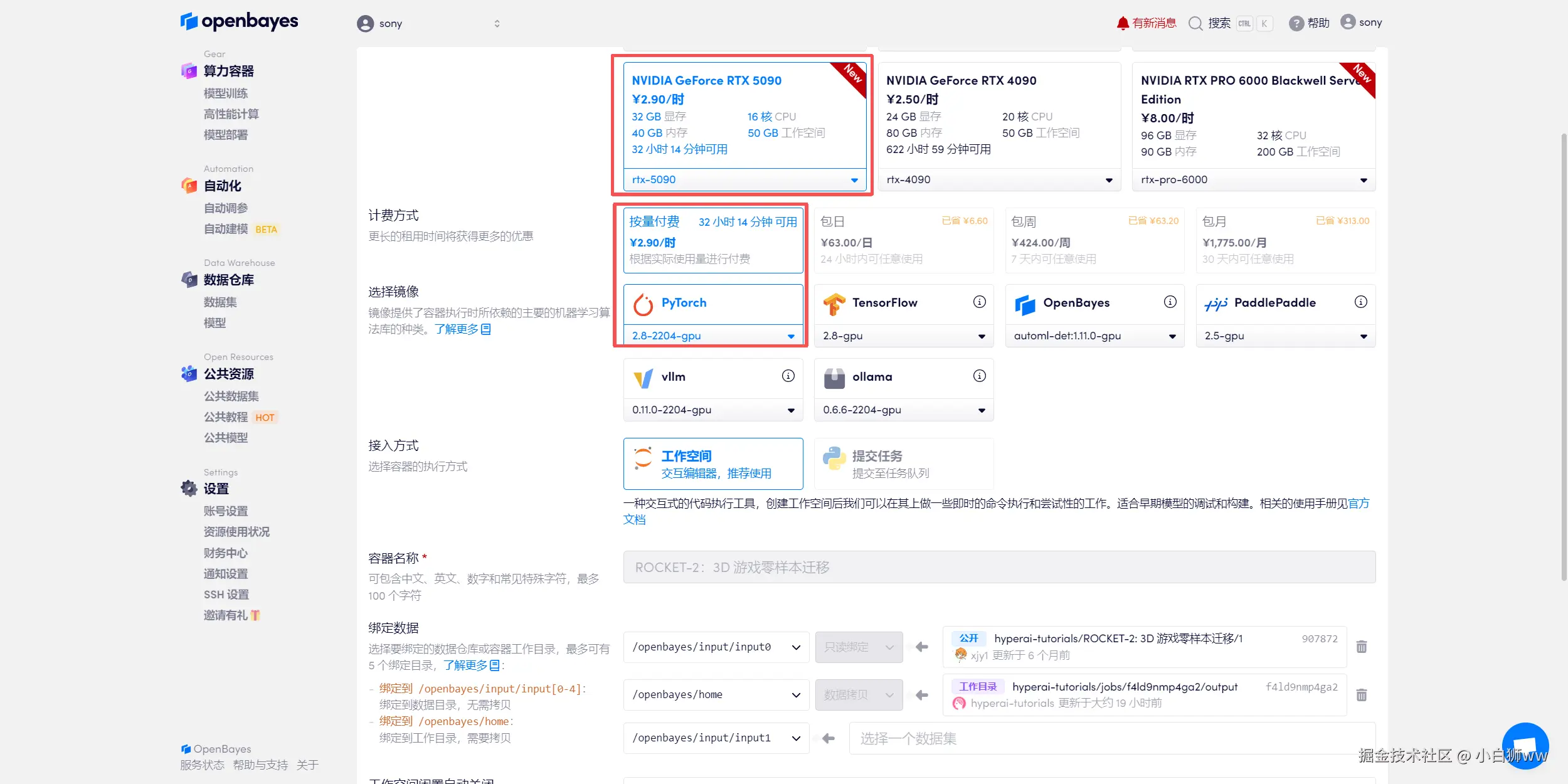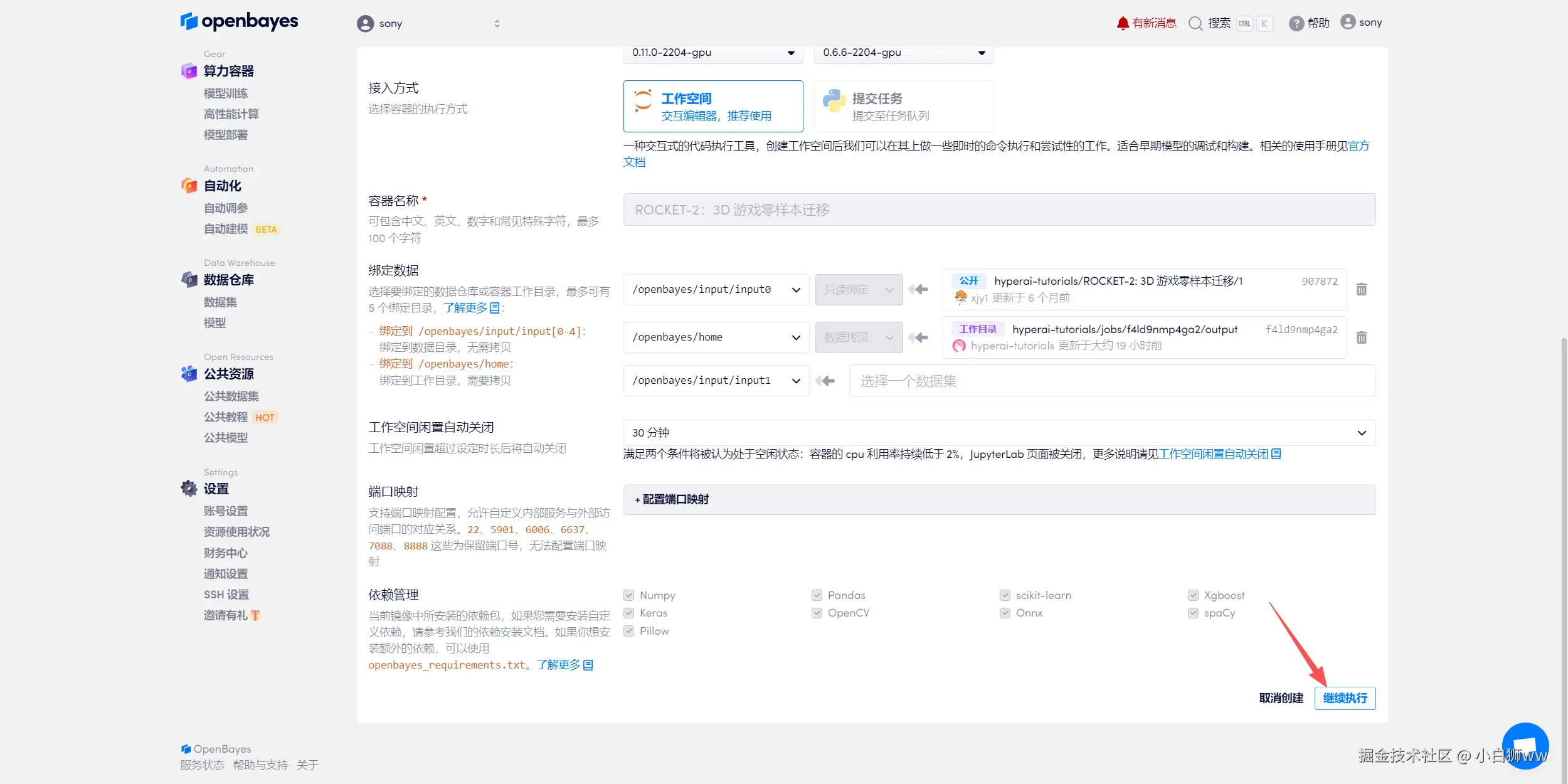 在当前页面中看到的算力资源均可以在平台一键选择使用。平台会默认选配好原教程所使用的算力资源、镜像版本,不需要再进行手动选择。点击「继续执行」,等待分配资源。