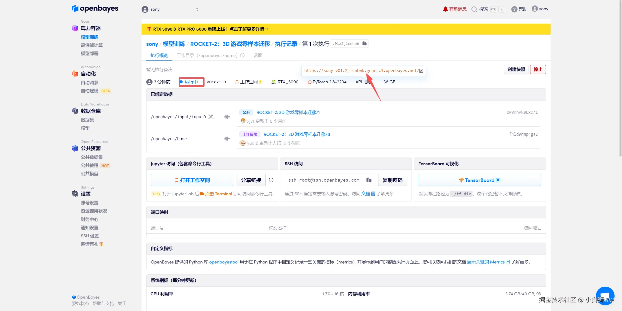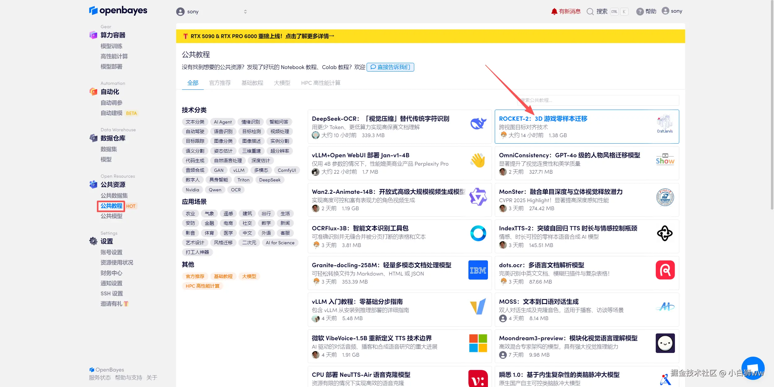 登录 OpenBayes.com,在「公共教程」页面,选择一键部署 「ROCKET-2:3D 游戏零样本迁移」教程。