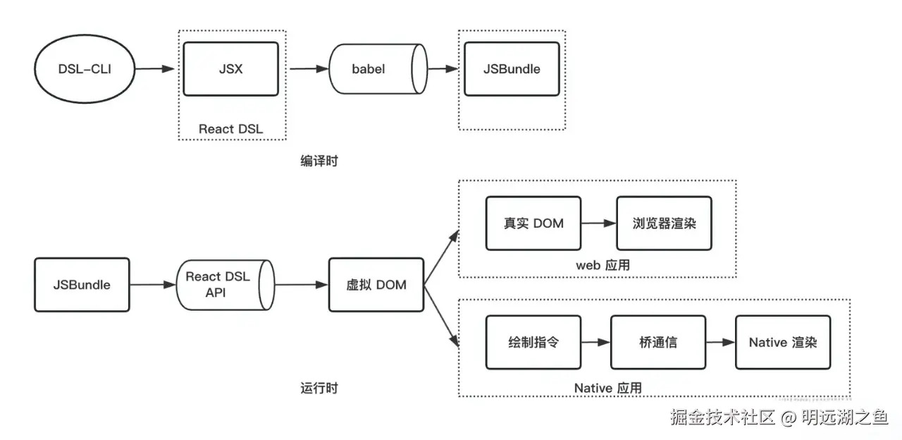 如果是 React DSL web 应用,那么可以通过浏览器加载 JSBundle ,然后通过运行时的 api 将页面结构,转化成虚拟 DOM , 虚拟 DOM 再转化成真实 DOM, 然后浏览器可以渲染真实 DOM 。