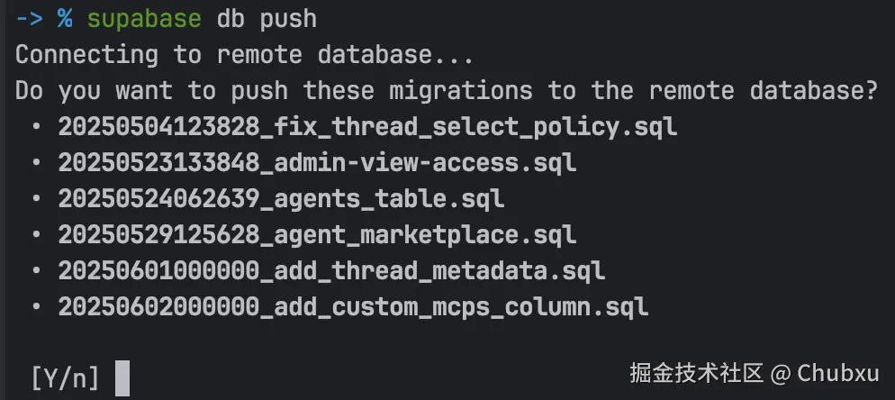 最后执行如下命令进行数据库迁移,Suna已经为我们准备好了所有迁移文件,我们进需要简单执行下面的命令即可。然后输入Y确定迁移。