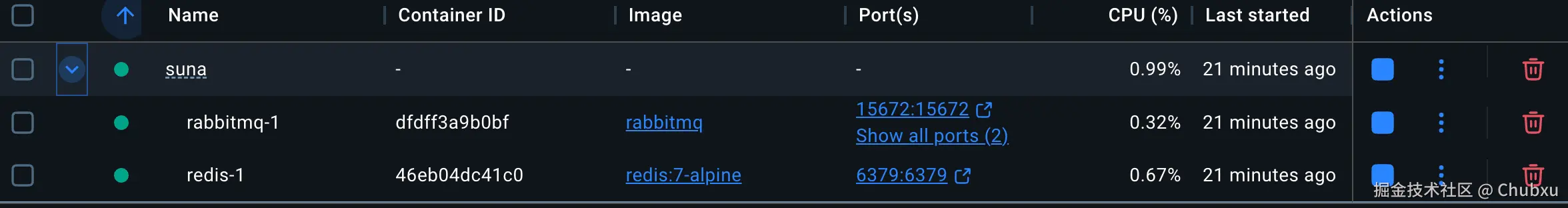 我们先构建基础环境,Suna依赖redis作为信号通信和中间数据存储媒介;依赖rabbitmq解耦后端接口和agent执行逻辑。因此我们需要先启动这两个容器才能顺利启动后端工程。