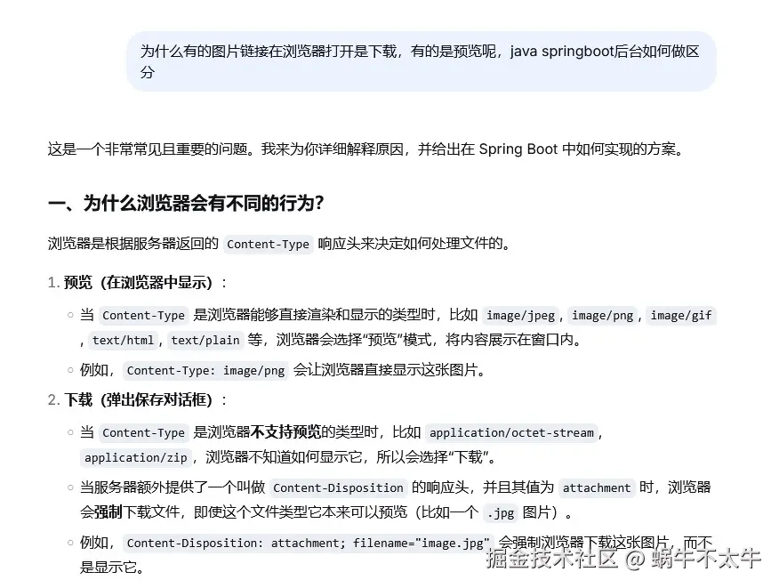 正当我快要放弃的时候,突然想到一个现象,为啥单独在浏览器里打开网站里的图片链接是预览,而打开自建服务器的图片链接是下载呢? 问了下deepseek